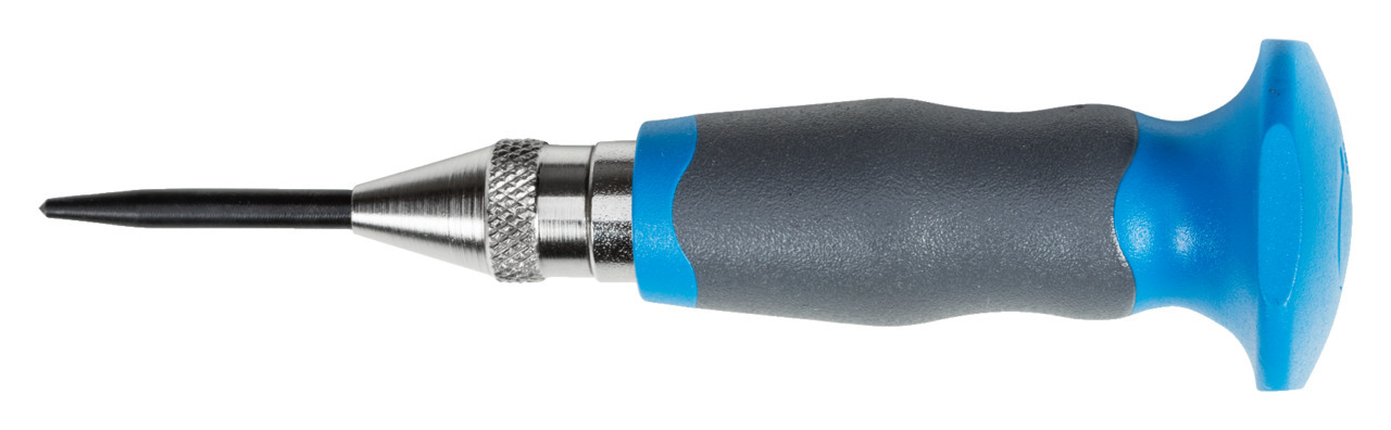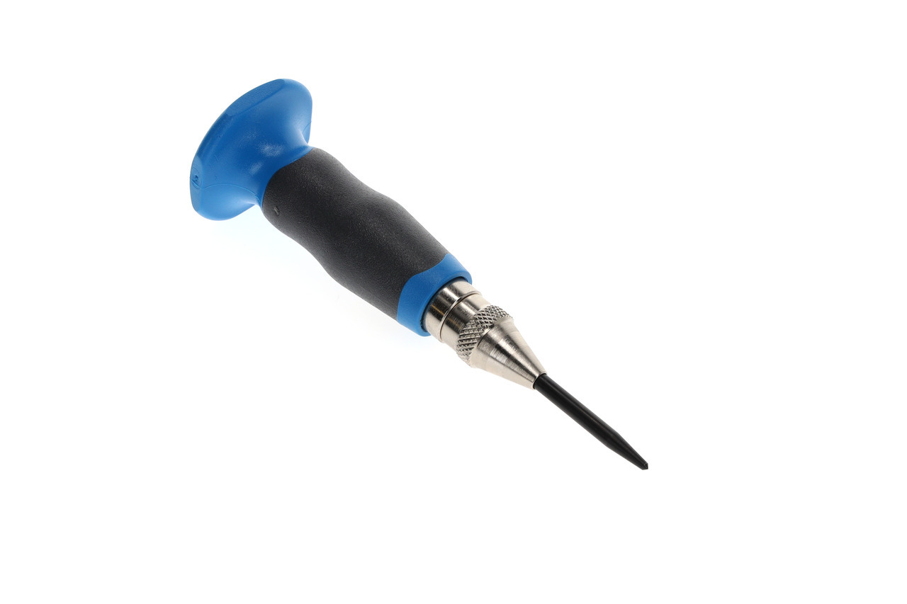 Automatické spôsobenie úderu prostredníctvom mechanizmu pružinového, Sila úderu regulovaná prostredníctvom závitu, S ochranou ruky pre komfortnú a bezpečnú prácu, Niklované, Náhradný hrot E-101