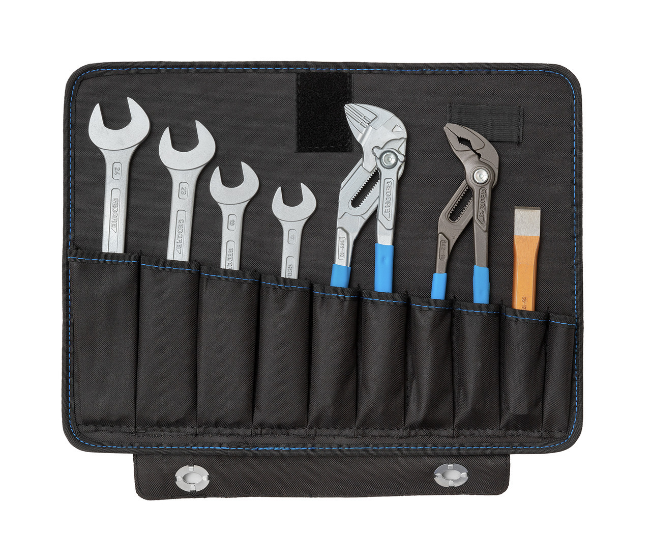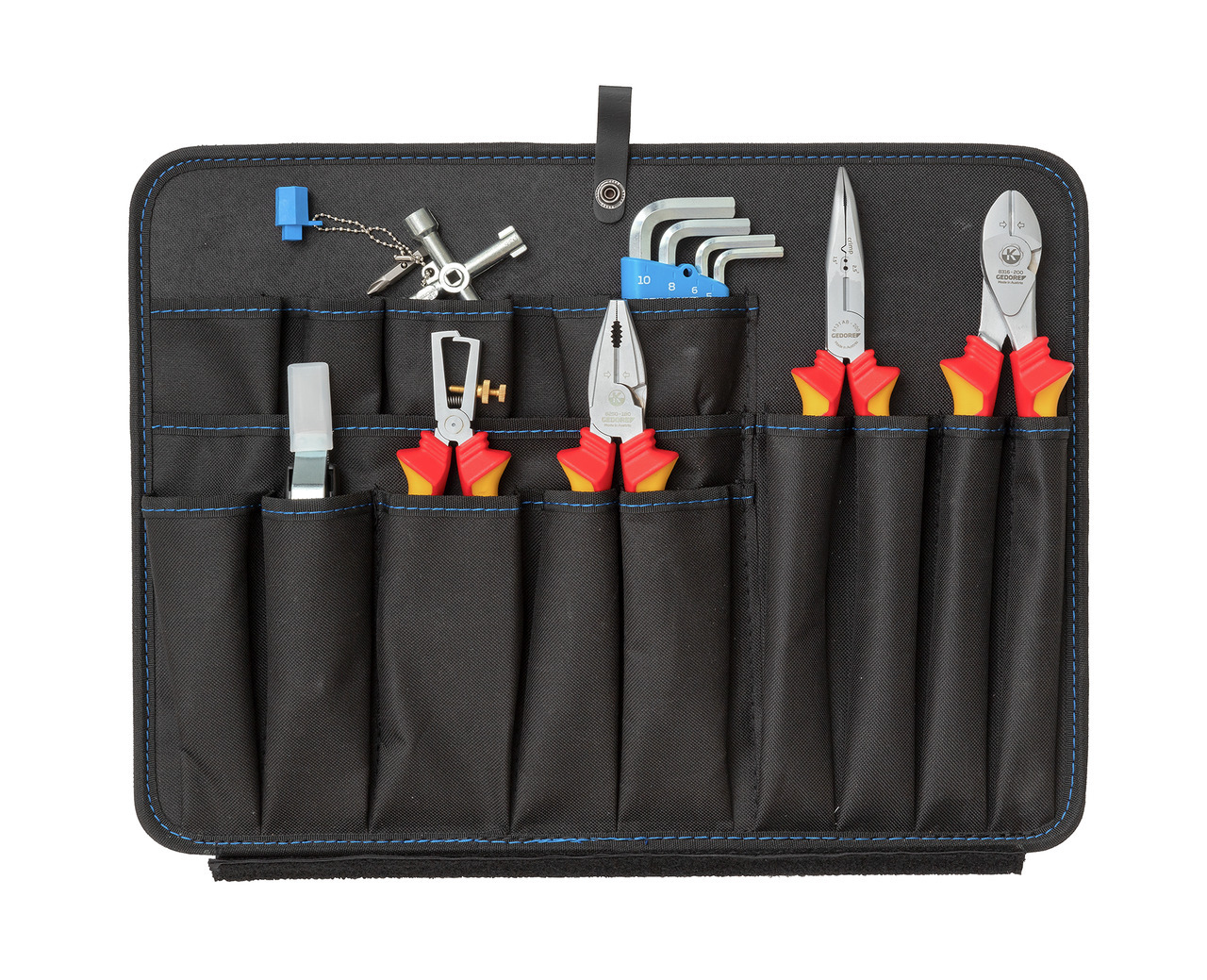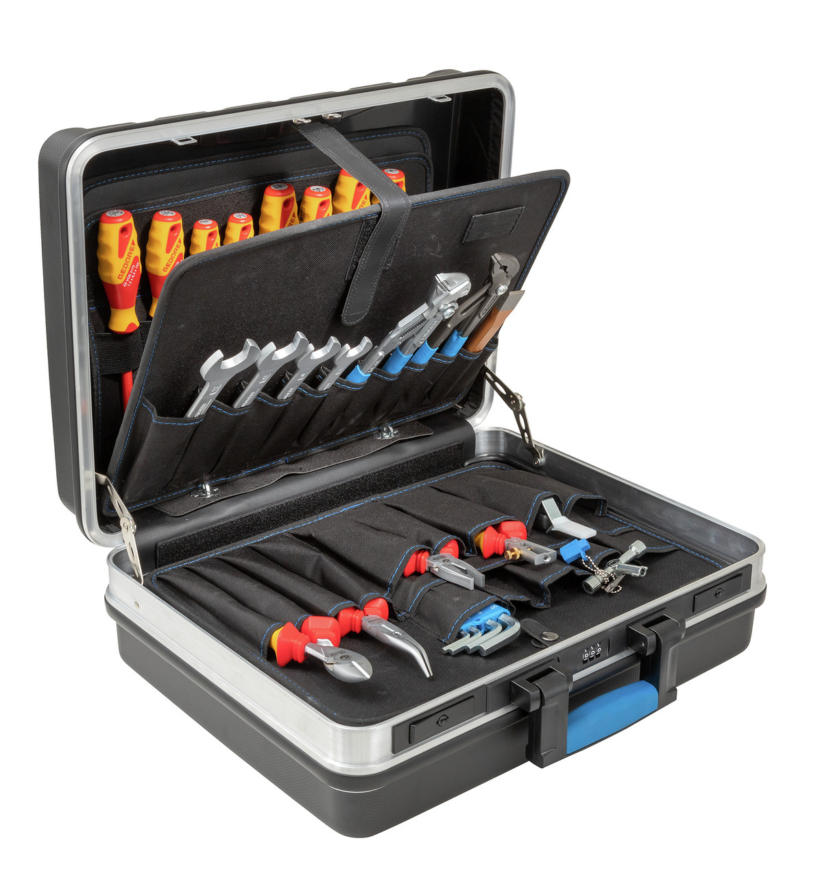 Ideálny súbor nástrojov pre elektrikára a dozorcu, prakticky navrhnutý na použitie na mieste, umiestnený v pevnom puzdre z tvrdého plastu odolného voči nárazom. Hliníkový rám, 3 kovové pánty, 4 podlahové vodiace lišty a skrutkovaná rukoväť s integrovanými zámkami, robustný spoločník - všade tam, kde musí byť správny nástroj vždy po ruke, náradie GEDORE, chrómané, rozmery: šírka 480 x hĺbka 370 x výška 180 mm