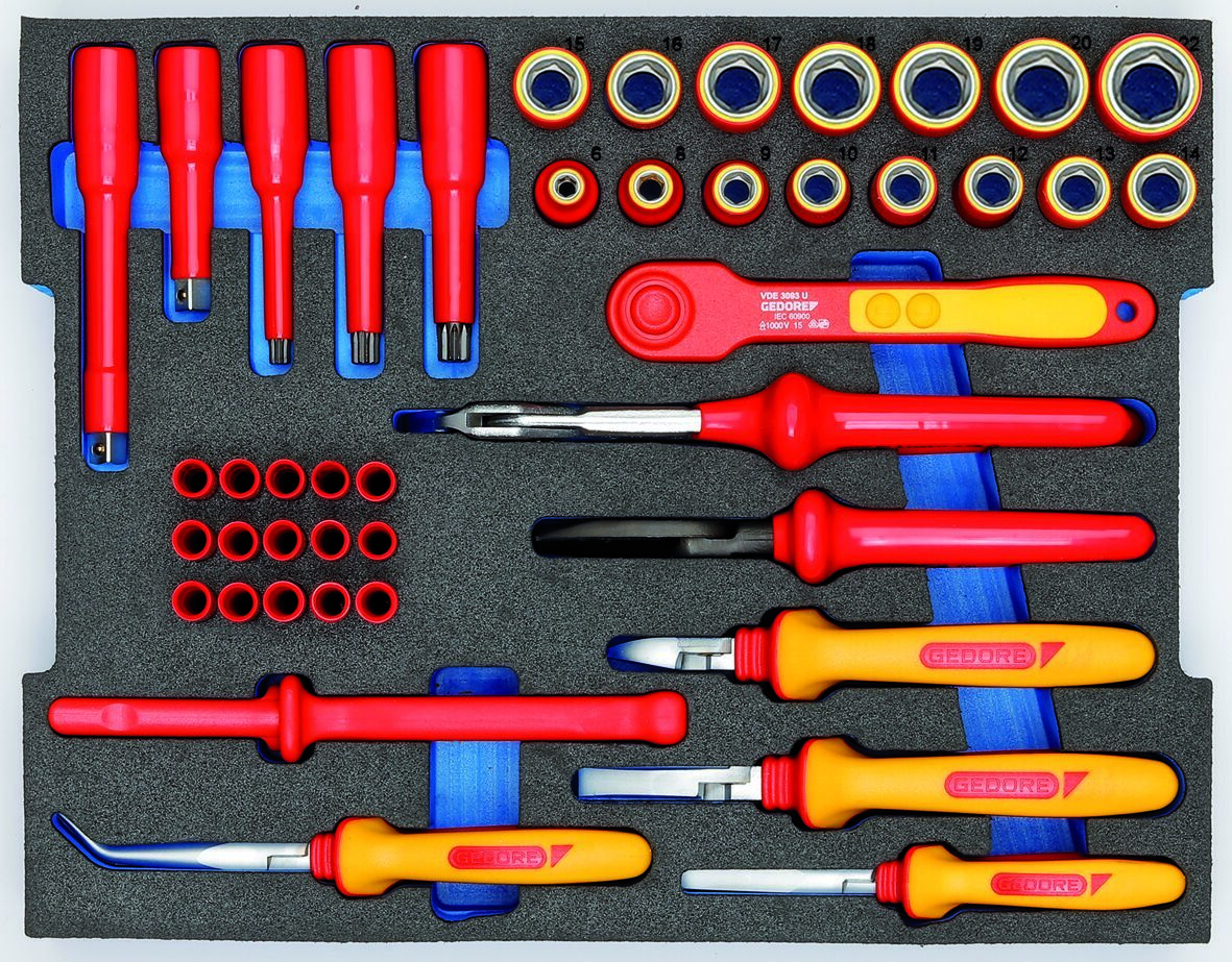Vo svojej unikátnej kombinácii súprava náradia VDE a doplnková súprava ponúkajú možnosť ideálneho zabezpečenia a práce na hybridných a elektrických vozidlách. Ideálne na opravy a údržbu vozidiel všetkých výrobcov. Všetky náradia sú izolačne chránené v súlade s normou EN 60900/EC 60900. Vybavené digitálnym meracím prístrojom napätia HV a prázdnym priestorom na momentový kľúč VDE 4508-02 / -05.