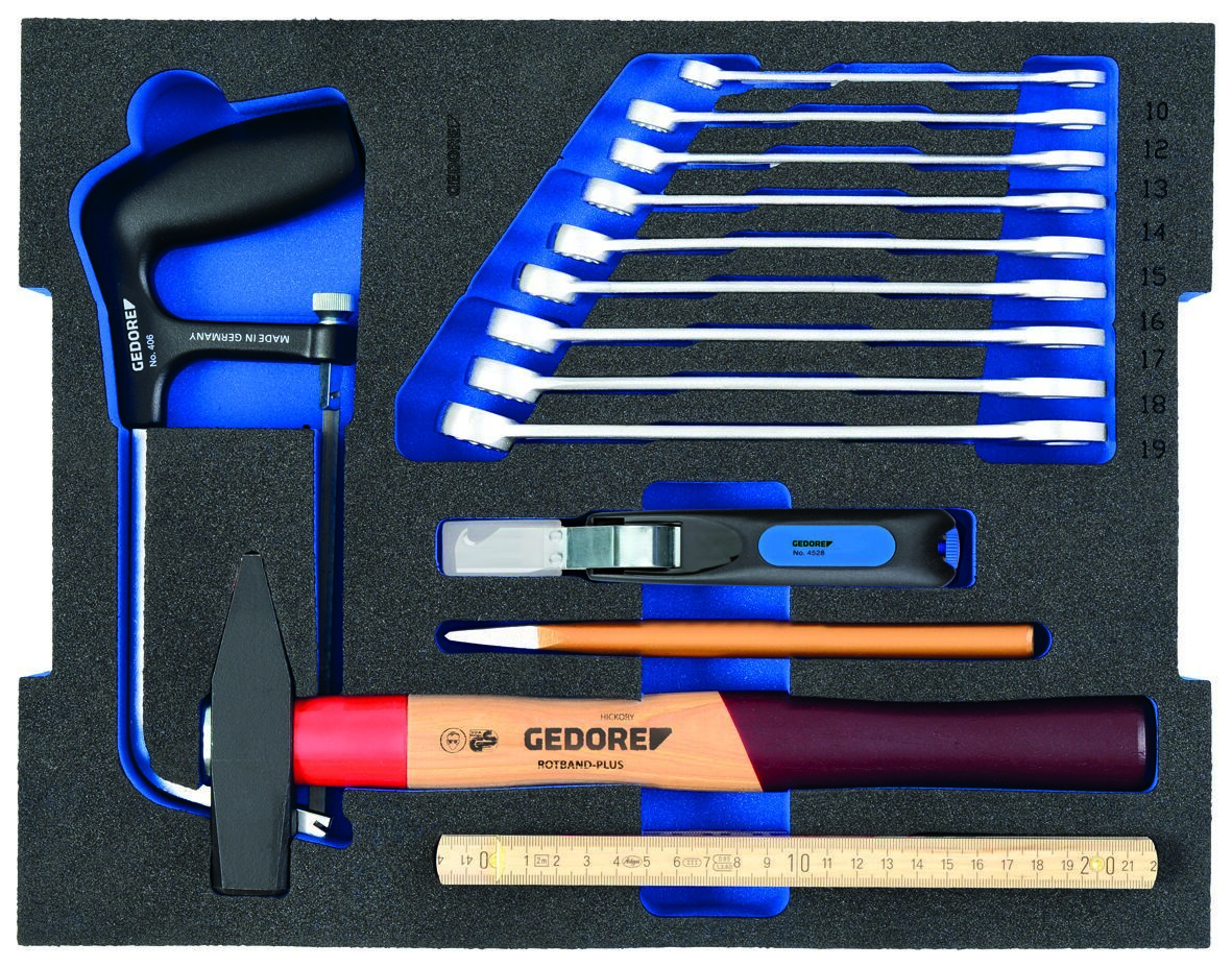 - Zoznam dielov (text): Kľúč plochý s ráčnou očkovou č. 7 R, 10 12 13 14 15 16 17 18 19 mm Univerzálny nôž na káble č. 4528, čepeľ L. 50 mm mierka článkov drevených č. 4533-2, 2 m Hobby píla č. 406, pílový list L. dláto ploché 145 mm č. 95-200, 200x23x13 mm inžiniersky kladivo č. 600 H-500, 500 g