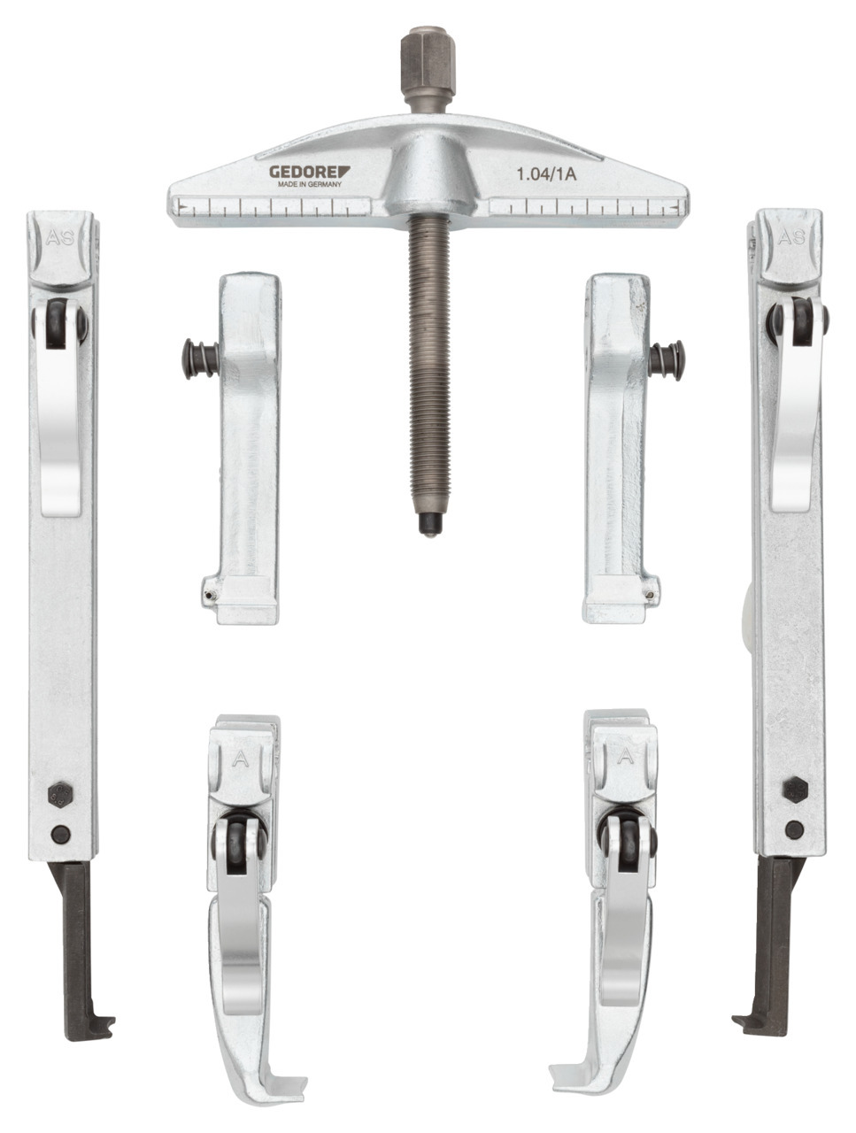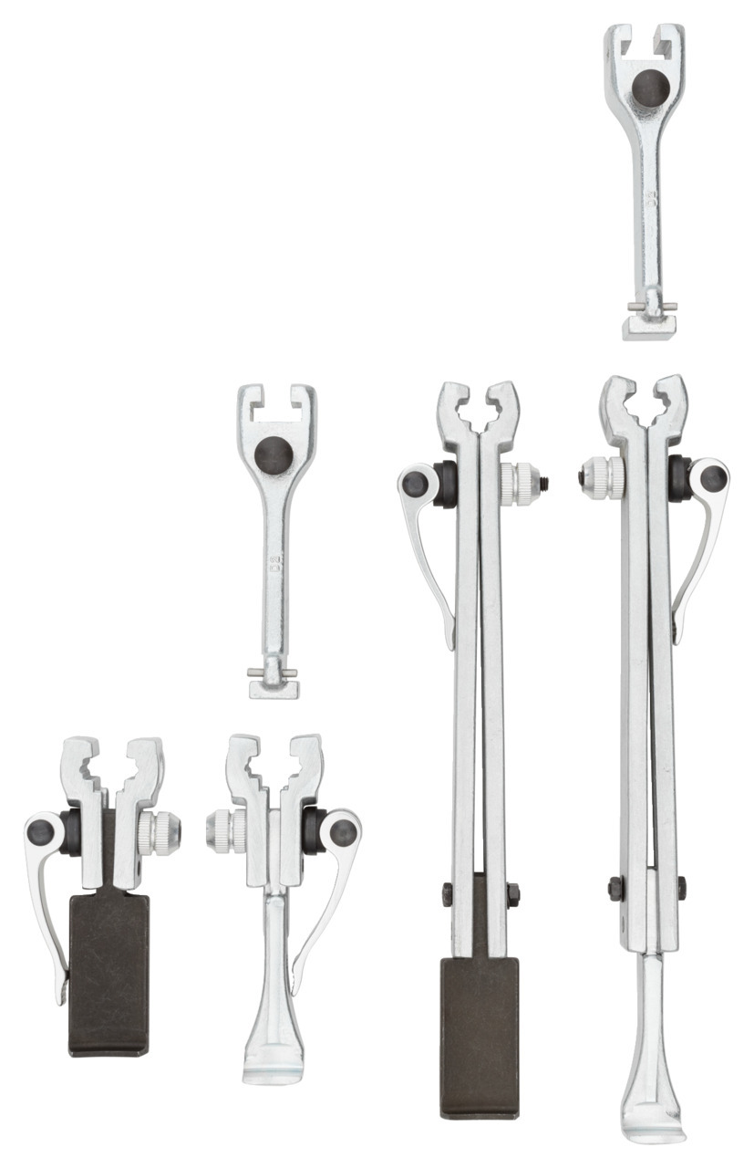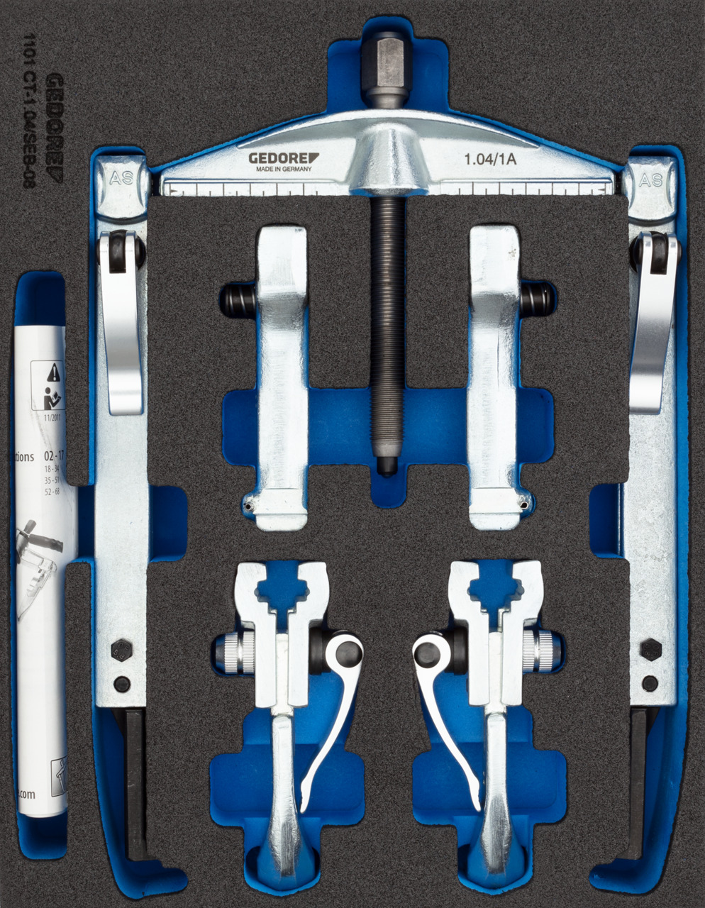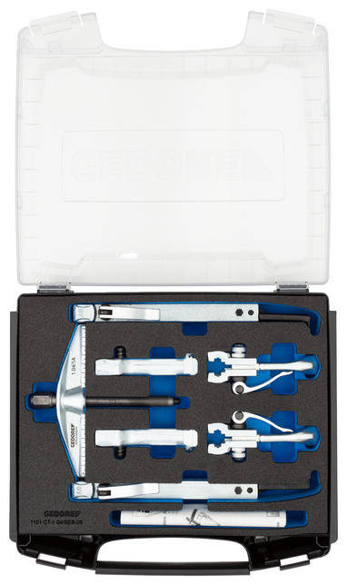 Na uvoľnenie tesných spojení na hriadeľoch alebo v krytoch, univerzálny set s dvojramenným ťahom, predlžovacími ramenami, dĺžkami ramien, hákovými nohami na vonkajšie a vnútorné ťahanie, vhodný na striedavé snímanie/ťahanie, vďaka rozsahu uchytenia bezstupňová regulácia do 130 mm / hĺbka uchytenia 100, 200, 250, 350 mm, variabilná, rýchla a bezpečná práca vďaka mechanizmu rýchleho uchytenia, hákovému brzdovému systému, hákom do úzkych montážnych priestorov, bezúdržbové vreteno, vymeniteľné koncovky vretena, dlhá životnosť a vysoké rezervy bezpečnosti, pretože priečky, háky a predlžovacie ramená sú kované za tepla v matrice, úzke nohy ramena mimoriadne vhodné do ťažko prístupných miest, možné spojenie 8 rôznych ťahov, s vložkou Check-Tool na rýchle rozpoznanie chýbajúceho náradia, vyrobené v Nemecku