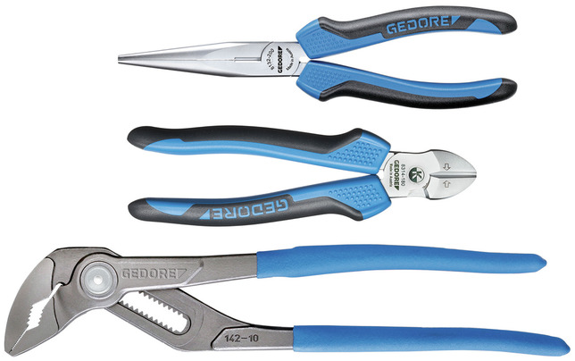 - Zoznam dielov (text): Univerzálne kliešte č. 142 10 TL, 10", 15-násobné, nastaviteľné, ponorovo izolované Kliešte s plochým nosom č. 8132-200 JC, 200 mm, rukoväť 2-komponentná bočné kliešte POWER č. 8314-180 JC, 180 mm, dvojzložková rukoväť