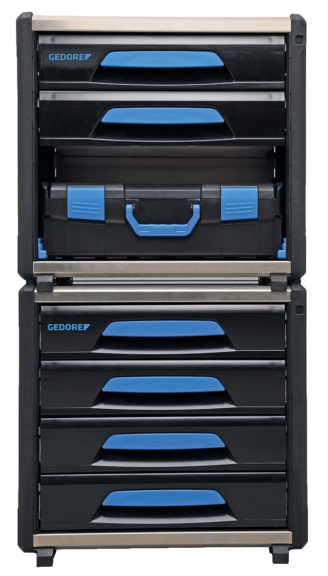 4 zásuvky s plným výsuvom, vhodné pre moduly GEDORE 1500 ES/1500 CT, Ľahká a stabilná zmes hliníka a plastov, Kompatibilný s vybavením vozidiel Sortimo® a zabezpečením nákladu, Test nárazu, Nosnosť každej zásuvky 30 kg, Rozmery: 526 x 396 x 506 mm, Vnútorné rozmery zásuvky: šír. 418 x hĺb. 314 x výš. 89 mm