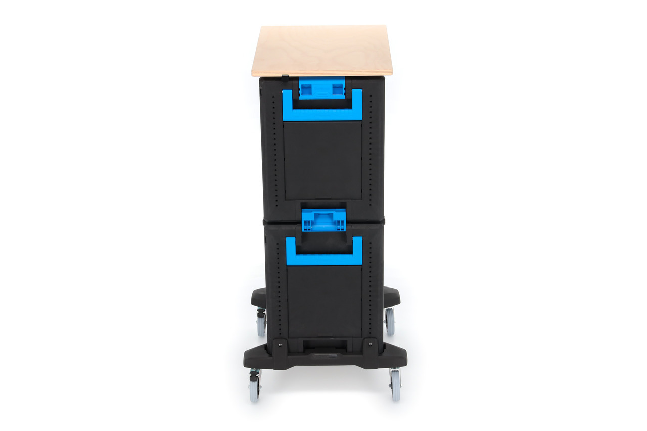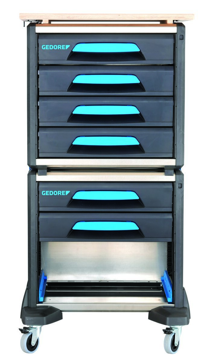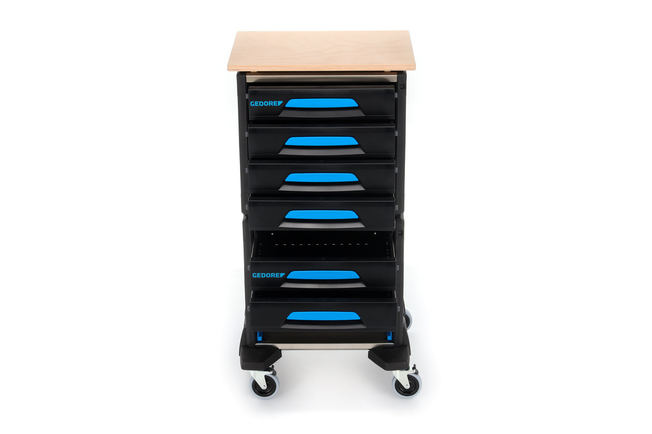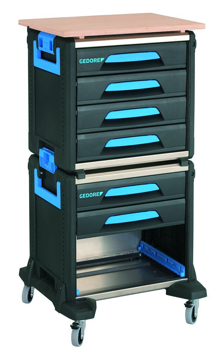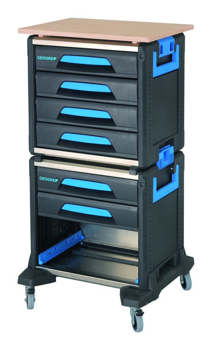 Modulárny vozík na náradie, pozostáva z: č. 1110 WM 24, 1110 WM 221, 1110 WMR 23 a 1110 WMHP 2, Mobilný ako kompletná jednotka alebo každý modul individuálne prenosný, Ideálny na prepravu z dielne do meniacich sa pracovných miest, 6 zásuviek s plným výsuvom vhodných pre moduly GEDORE 1500 ES/1500 CT, Pre 2x 1/3 modulov alebo 1x 2/3 modulov, Jedna komora s zámkom pre GEDORE L-BOXX® 136 č. 1100 L (nie je súčasťou balenia), Ľahká a stabilná zmes hliníka a plastov, Koľajnice na skútroch s 4 vysokokvalitnými kolesami, vrátane 2 s úplnou brzdou, Drevená pracovná doska na montážne práce na stavenisku, Kompatibilný s vybavením vozidla Sortimo® a zabezpečením nákladu, Test nárazu, Rozmery: šírka 526 x hĺbka 396 x výška 1172 mm, Malá hmotnosť (až 50% ľahší ako porovnateľné riešenia!)