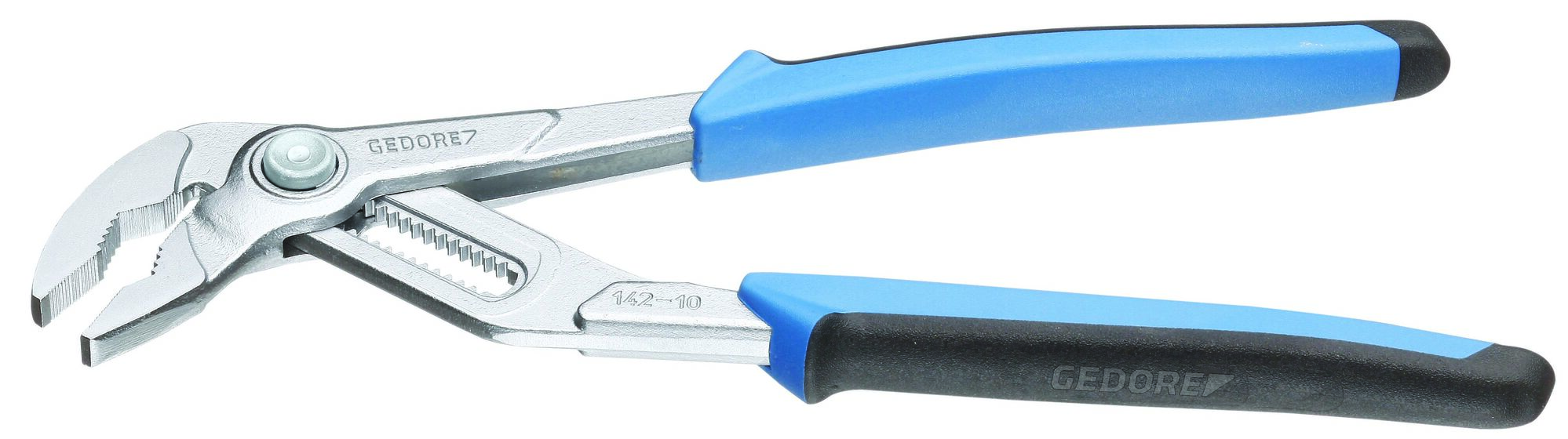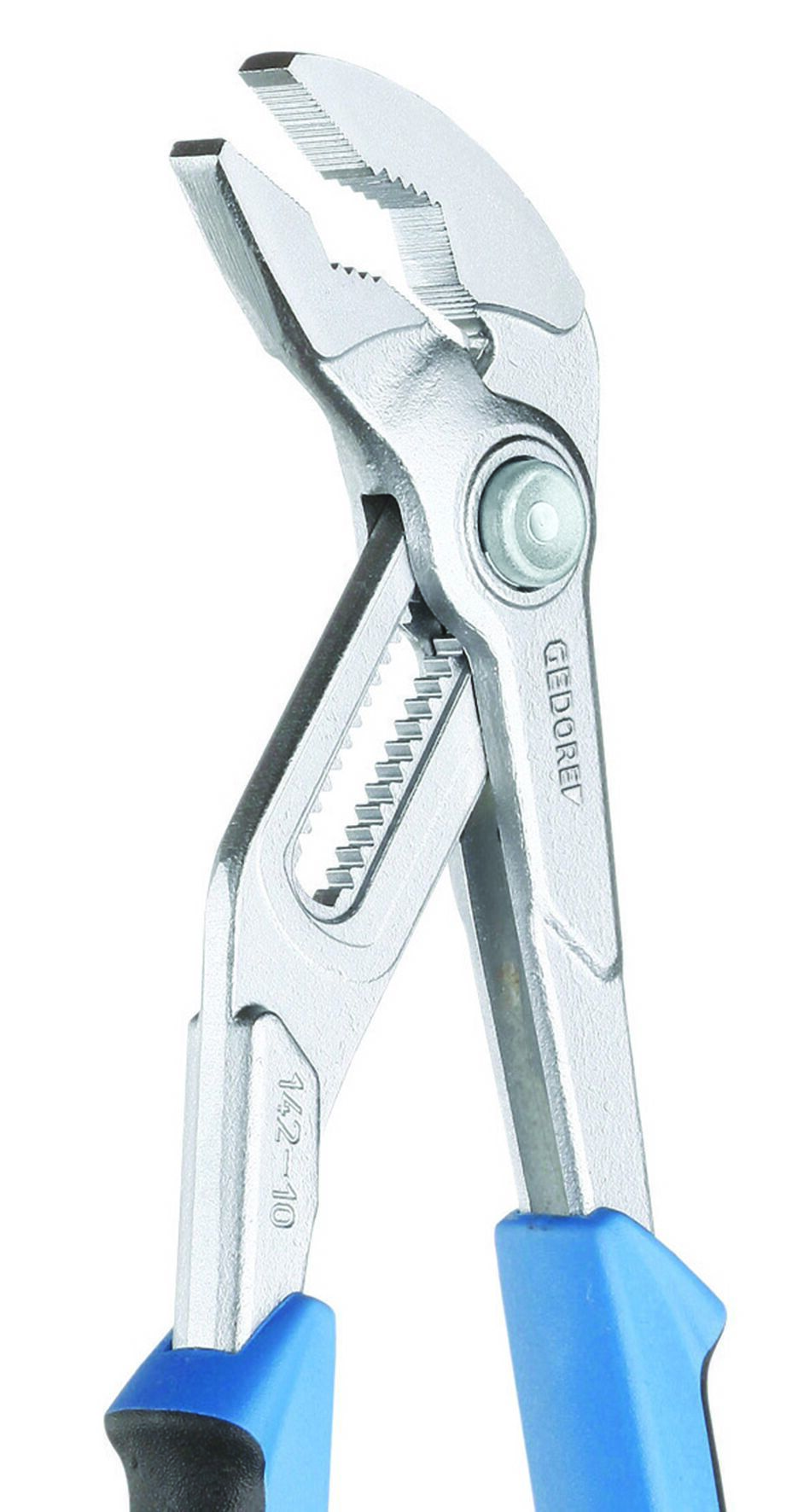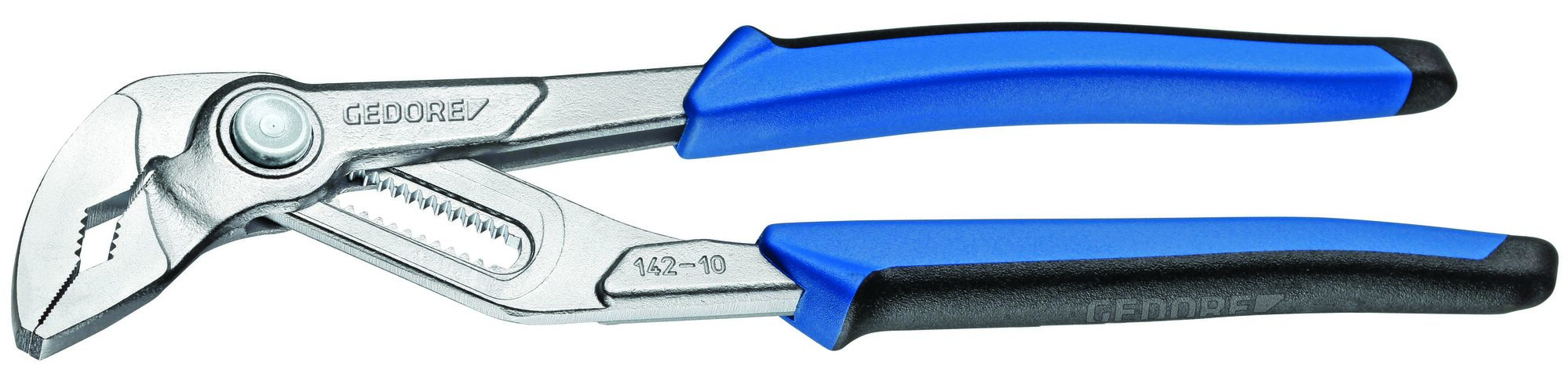 Konstrukcia podľa DIN ISO 8976 forma C, S kĺbovým puzdrom a zabezpečením upínania, Presná regulácia pomocou tlačidla, Č. 142 10 = 15-smerová regulácia, Regulácia jednou rukou pomocou tlačidla s veľkou aktívnou plochou, Štíhle čeľuste a úzke steny čeľustí robia kľúč ľahším, Dlhé čeľuste klieští, Posunuté uchopovacie plochy, samočinne sa upínajúce na matice a rúry, GEDORE chrómovo-vanádiová špeciálna oceľ, Zuby kalené indukčne, Vyhotovenie JC = chrómované, s 2-zložkovým poťahom úchopov, šírka rozpätia 38 mm