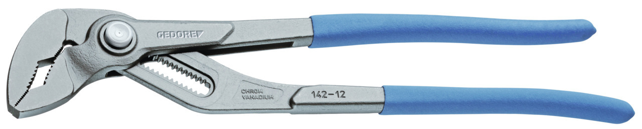 Konstrukcia podľa DIN ISO 8976 forma C, S kĺbovým spojom a zabezpečením upínania, Presná regulácia pomocou tlačidla, Č. 142 12 = 17-stupňová regulácia, Regulácia jednou rukou pomocou tlačidla s veľkou aktívnou plochou, Štíhle čeľuste a úzke steny čeľustí robia kľúč ľahším, Dlhé čeľuste klieští, Posunuté uchopovacie plochy, samočinne sa upínajúce na matice a rúry, GEDORE chrómovo-vanádiová špeciálna oceľ, Zuby kalené indukčne, Vyhotovenie TL = bezfarebný náter, s modrými krytmi rukoväte natieranými ponorením, šírka rozpätia 44 mm