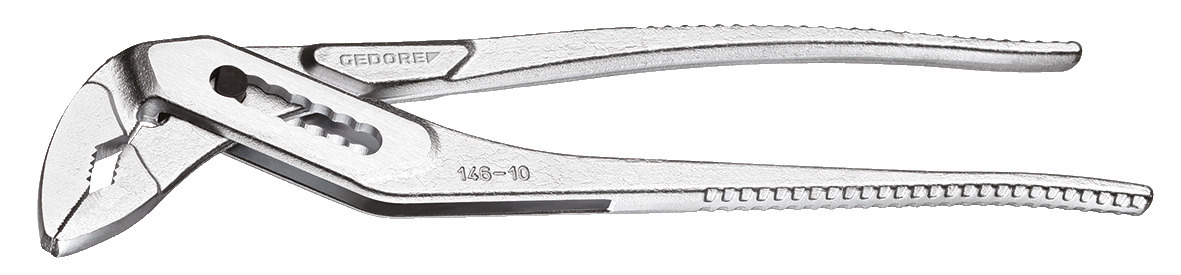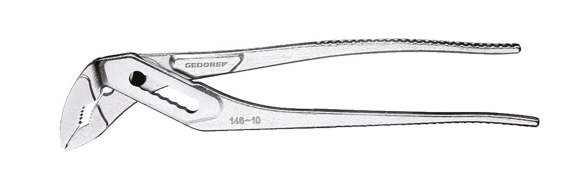 Konstrukcia podľa DIN ISO 8976 forma C, S pripojením bezpečnostného kĺbu a zabezpečením upínania, Samozaciskanie vďaka odsunutým uchopovacím plochám, GEDORE špeciálna chrómovo-vanádiová oceľ, chrómovaná, s lešteným zrkadlom, Zuby kalené indukčne, Konstrukcia C = štíhle nohy držadla s kovanými výstupkami, Vyhotovenie JC = chrómované, s 2-zložkovým obalom úchopov