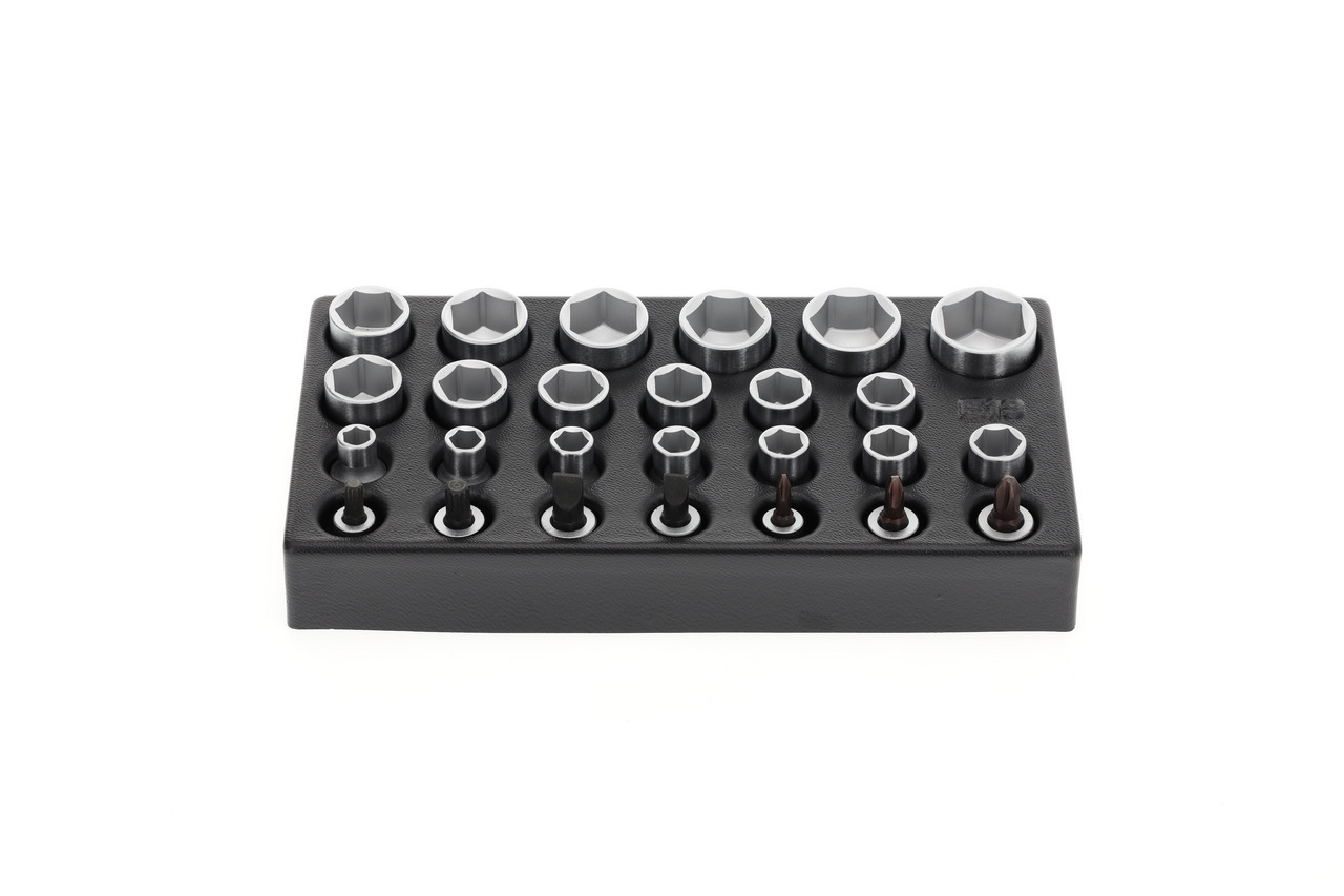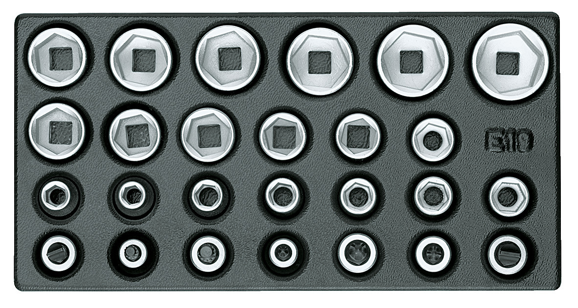 Dodávaný v 1500 moduloch ES, vyrobený z odolného voči nárazom materiálu ABS, čierno-štruktúrovaný, odolný voči pôsobeniu olejov a kyselín, každé náradie leží protišmykovo vo vlastnom výreze, ľahko vyberateľné vďaka zapusteným úchytom.