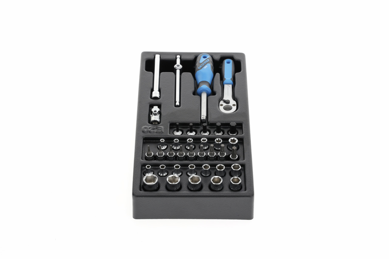 Dodávaný v 1500 moduloch ES, vyrobený z odolného voči nárazom plastu ABS, čierno-zrnistý, odolný voči pôsobeniu olejov a kyselín, každé náradie leží protišmykovo vo vlastnom výklenku, ľahko vyberateľné vďaka zapusteným úchytom.
