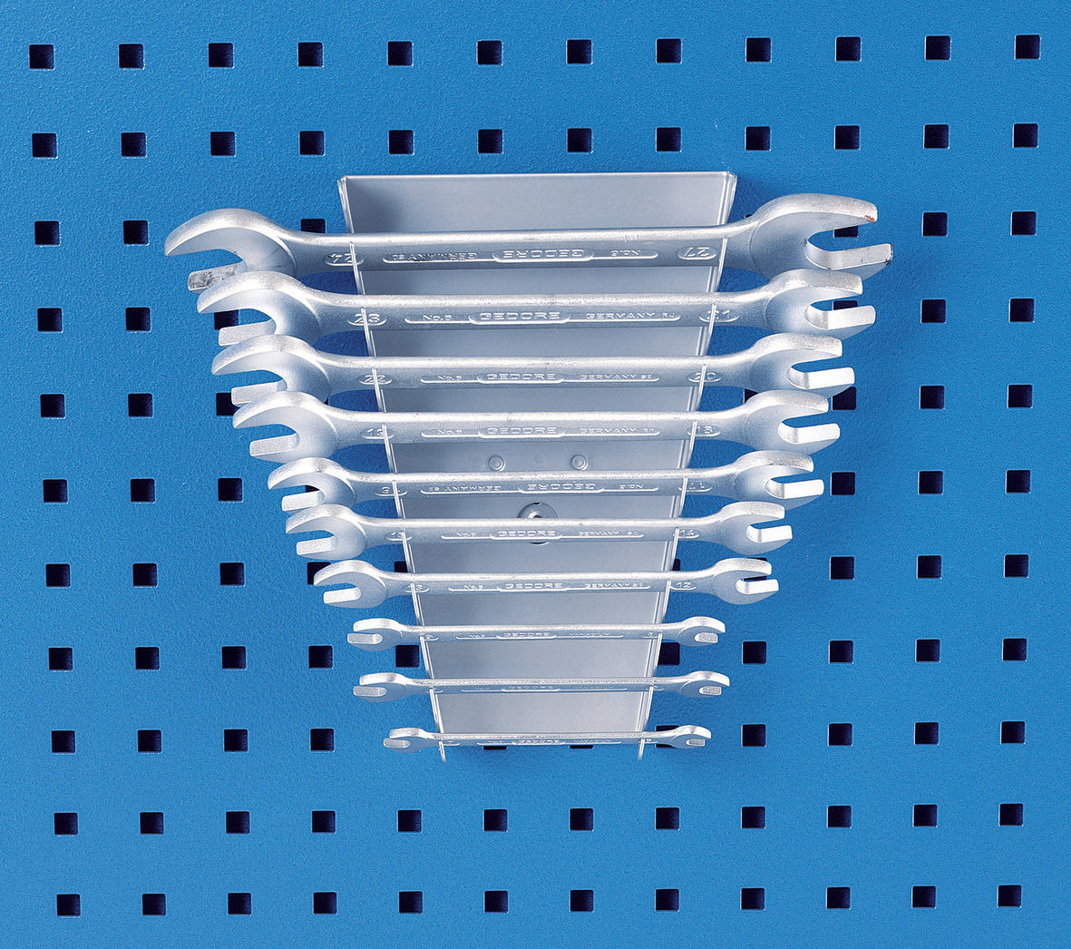 Pasujú do perforovaných plechov s otvormi 10 x 38 mm, Na 10 kľúčov č. 2, 6, lakované práškovou farbou, Dodávka bez náradia