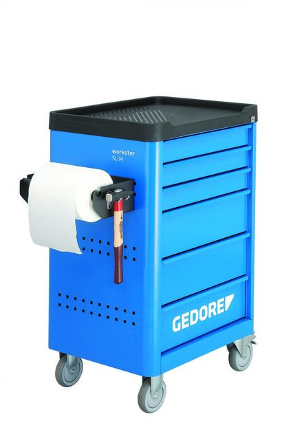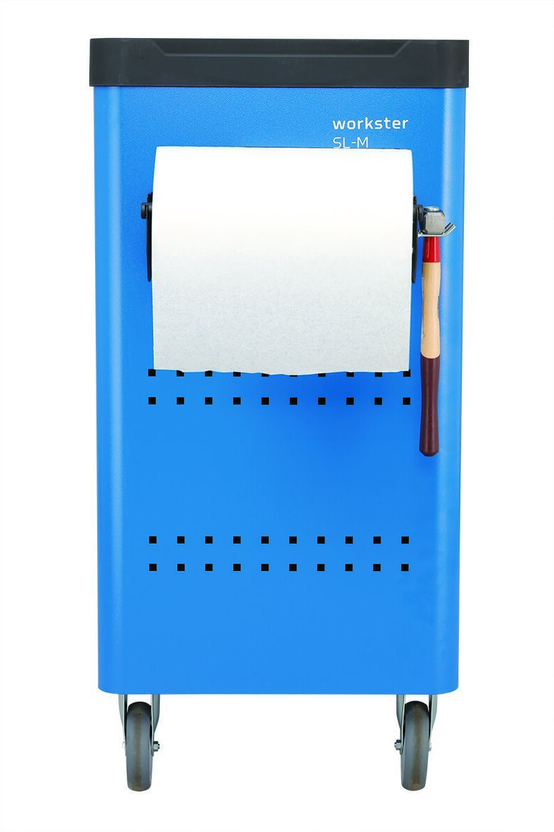 Do roliek papiera o priemere do 320 mm a šírke 320 mm, Bočné perforácie na dodatočné háky (nie sú zahrnuté v dodávke), Vyrobené z oceľového plechu, Farba RAL 9005 Čierna, Vhodné pre všetky vozíky s náradím/stoly s otvormi Euro 10 x 38 mm, Dodávka bez náradia a príslušenstva