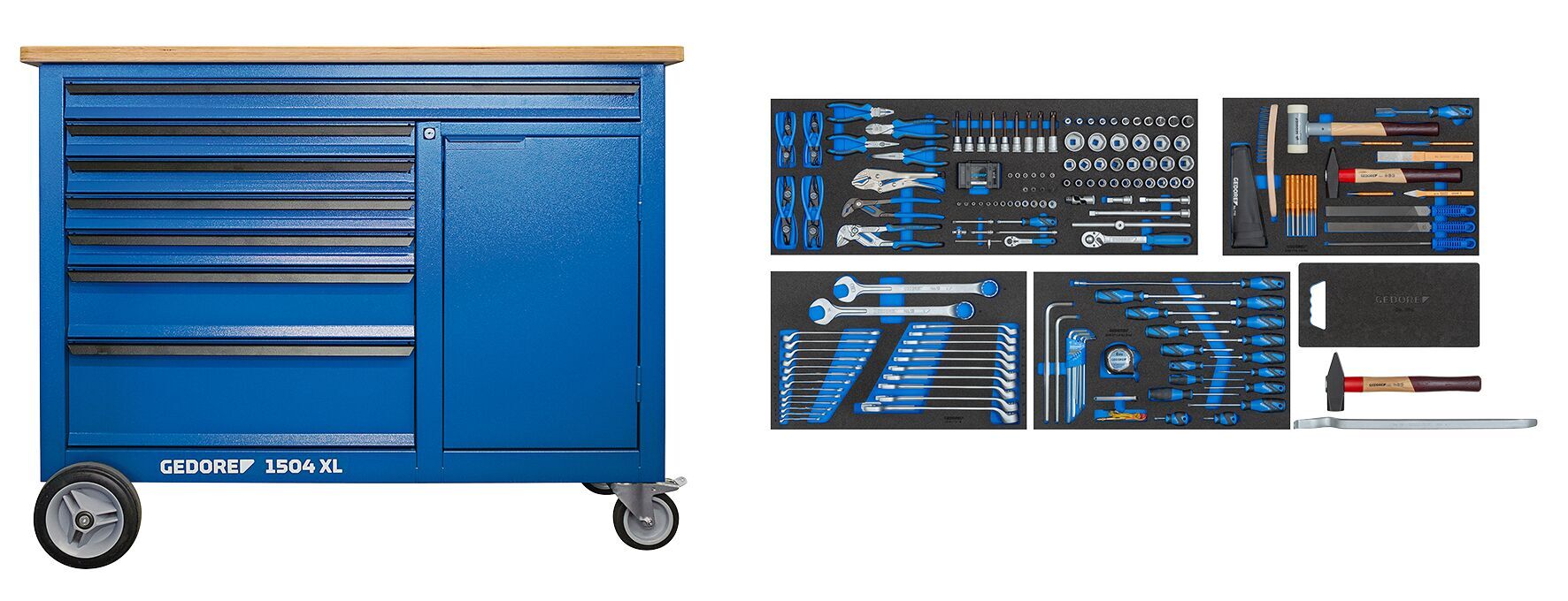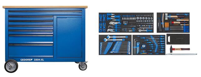 Asortiment: Ideálny do pracovných servisných a údržbových činností na poľnohospodárskych strojoch, Nástroje s metrickými rozmermi, So systémom GEDORE-Check-Tool: Kontrola kompletnosti s použitím 2-barevných vložiek z penového materiálu, Odolnosť voči olejom a tukom, V pracovnom stole č. 1504 XL 1411, Korpus: Ocelový plech, odolný voči korózii a poškriabaniu, práškovaná farba, GEDORE modrá, Viacvrstvová lepená doska z bukového dreva s hrúbkou 30 mm, vonkajší povrch dodatočne chránený ľanovým olejom, Veľká úložná plocha s podlahovou policou a dverami, Bezpečnosť prostredníctvom ochrany nôh obsluhy, Zásuvky: Centrálna zámková blokácia s cylindrickým zámkom, 1 zásuvka XL (šírka 1055 x hĺbka 400 mm), zásuvky s šírkou 6 (šírka 640 x hĺbka 400 mm) s plným vysunutím, vyberateľné, Zabezpečovacia blokácia v každej zásuvke, obsluha jednou rukou, Vodiacie lišty na guľkových ložiskách, Nosnosť na zásuvku: 40 kg, dolná zásuvka s vysokou nosnosťou: 60 kg, Vysoko odolné zavesenie GEDORE: Celkové zaťaženie 1000 kg, počas jazdy 750 kg, 2 kolesá s vysokou účinnosťou s GEDORE valcovými ložiskami (pevné kolieska Ø 200 mm), 2 ľahko pohyblivé kolesá s GEDORE guľkovými ložiskami (otočné kolieska Ø 125 mm), obe s plnou blokáciou, Trapezová konštrukcia osi GEDORE funguje aj pri maximálnom zaťažení: ľahkosť pohybu, obratnosť a istota vedenia po nerovnostiach, Možnosti: Možnosť rozšírenia o zadnú stenu č. R 1504 XL-L, Špeciálne farby na objednávku