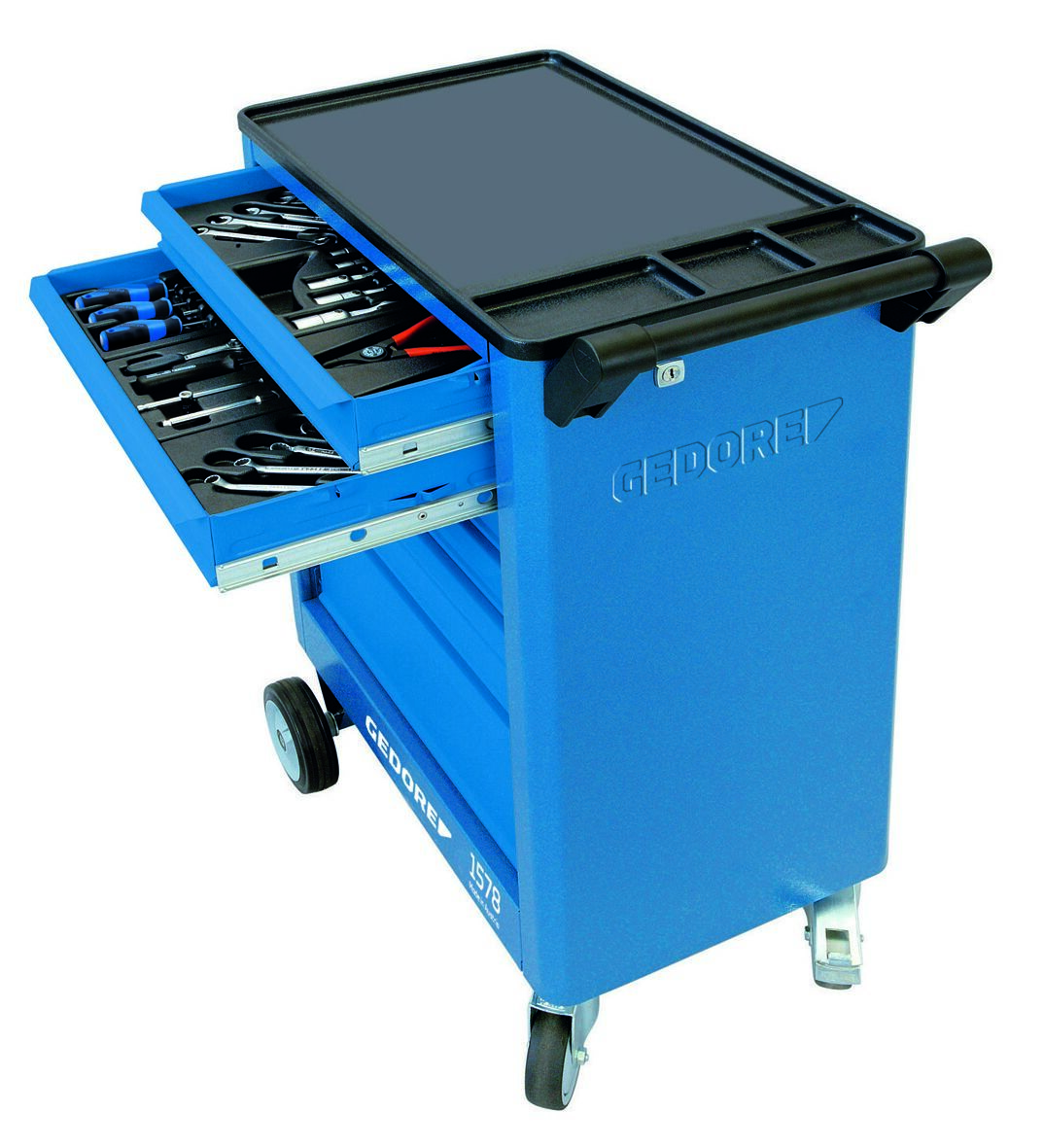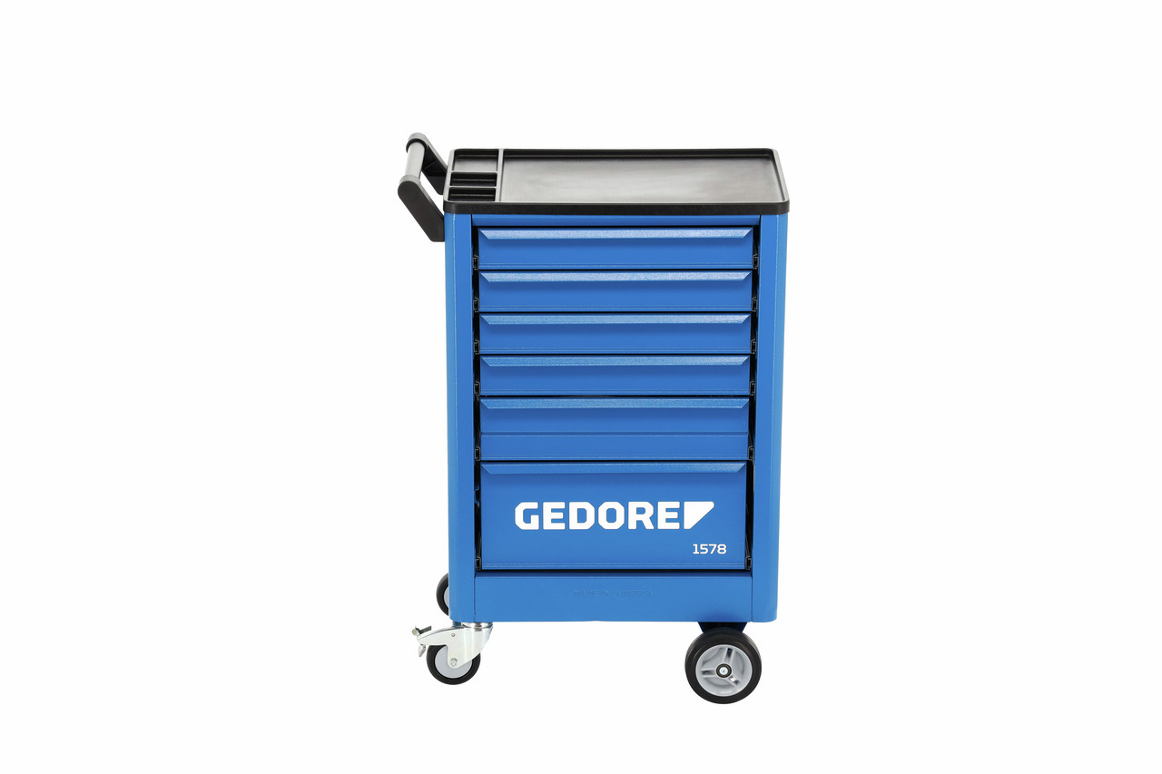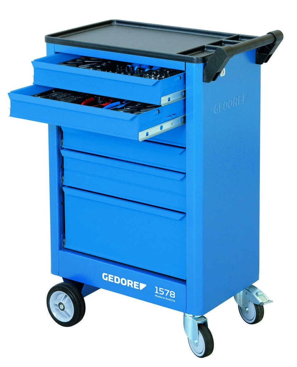 Korpus: Rozmery: výška 930 x šírka 605 x hĺbka 375 mm, Polica vyrobená z ABS plastu s 3 priehradkami na drobné súčiastky, Otočná a ľahko ovládateľná vďaka držadlu na jazdu a riadenie, Bezpečnosť prostredníctvom ochrany nôh obsluhujúcich, Oceľový plech, odolný voči korózii a poškriabaniu, práškovaná farba, GEDORE modrá, Zásuvky: Centrálna zámková blokácia s cylindrickým zámkom, 4 široké zásuvky (šírka 480 x hĺbka 325 x výška 75 mm), 1 široká zásuvka (šírka 480 x hĺbka 325 x výška 120 mm), 1 široká zásuvka (šírka 480 x hĺbka 325 x výška 210 mm), Všetky zásuvky s obojstranným výsuvom, Individuálne vybavenie priehradkami pozdĺžnymi a priečnymi (dodávané aj samostatne), Nosnosť každej zásuvky 20 kg, Oceľový plech, odolný voči korózii a poškriabaniu, práškovaná farba, GEDORE modrá, Zavesenie GEDORE: Celkové zaťaženie 200 kg, 2 vysoko výkonné kolieska GEDORE s valčekovými ložiskami (pevné kolieska Ø 140 mm), 2 guľkové ložiská GEDORE hladko otáčajúce kolieska (otočné kolieska Ø 100 mm), jedno s úplnou brzdou, Trapezová konštrukcia osi GEDORE funguje aj pri maximálnom zaťažení: ľahkosť jazdy, obratnosť a istota vedenia po nerovnostiach, Vybavenie: 6 pozdĺžnych priehradiek (LT) a 2 priečne priehradky (QT) vyrobené z pozinkovaného oceľového plechu, Možnosti: Môže byť optimálne vybavený nástrojovými modulmi GEDORE (č. 1500 ES/1500 CT), Špeciálne farby a verzie na požiadanie, Dodávka bez zobrazených nástrojov a príslušenstva