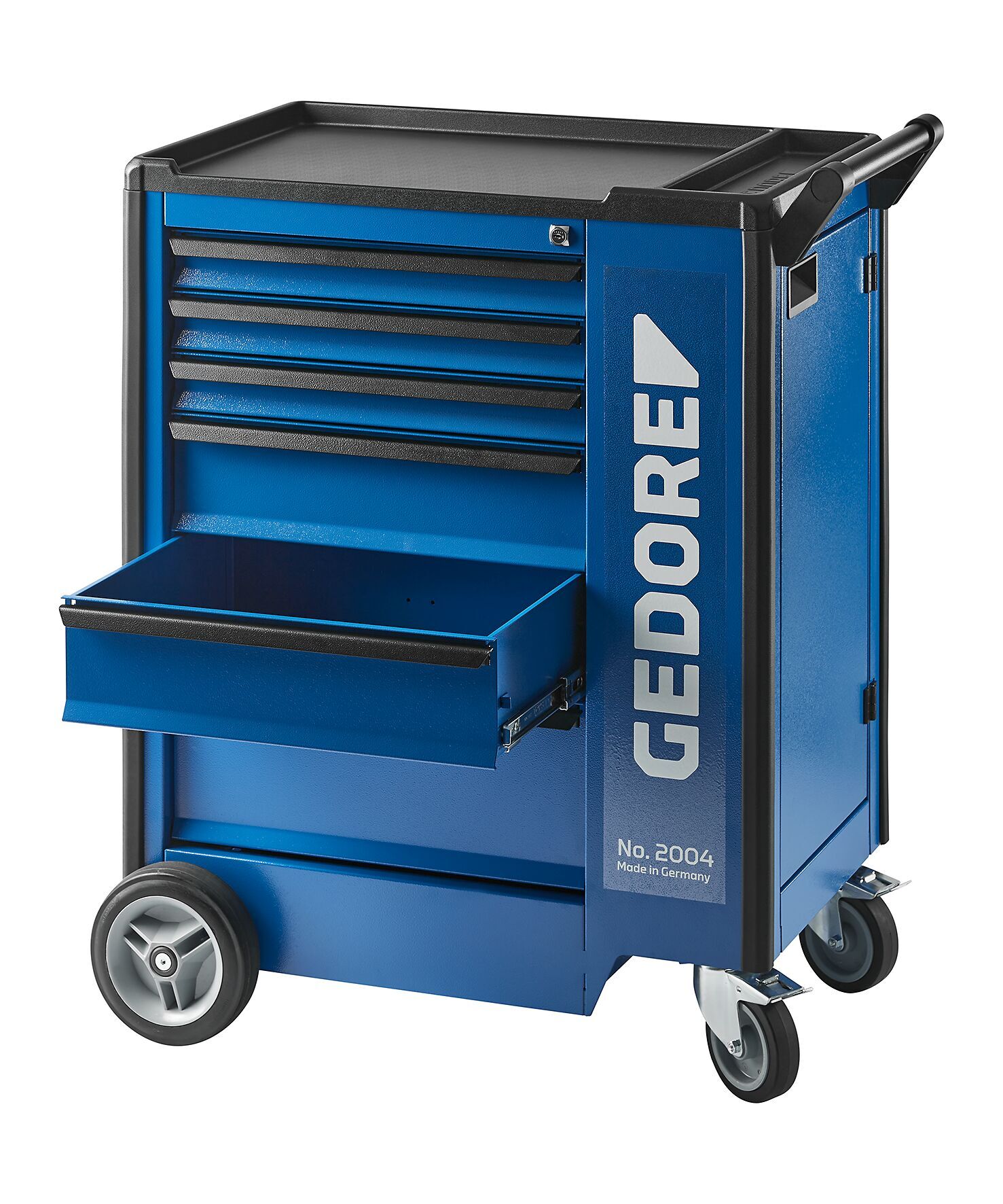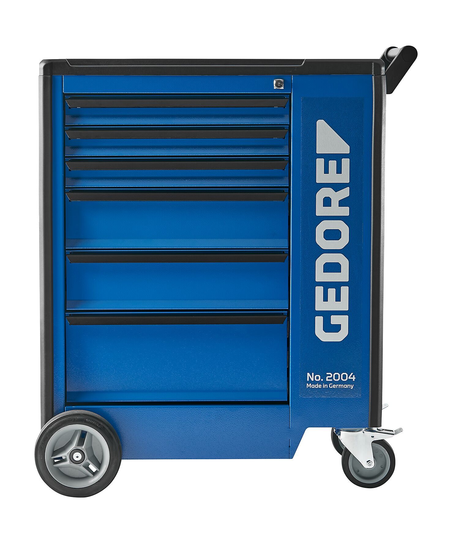 Korpus: Rozmery: výška 985 x šírka 775 x hĺbka 475 mm, Kryt z plastu ABS s 3 nádobami na drobné prvky, vybranie na 2 plechovky a otvory na 8 skrutkovačov, Úložný priestor s obložením z perforovanej ocele (Euro perforácia 10 x 38 mm) a 2 vyberateľnými zásuvkami na drobné súčiastky a dvierkami na strane držadla, Otočný a ľahko ovládateľný vďaka držadlu na jazdu a riadenie, Predná plocha s otvorom Euro 10 x 38 mm na upevnenie hákov a nástrojov, Bezpečnosť prostredníctvom ochrany nôh a protiúderových hrán pre osoby a okolie, Oceľový plech, odolný voči korózii a poškriabaniu, práškovo lakovaný, GEDORE modrý, Zásuvky: Centrálna zámková blokácia s cylindrickým zámkom, Široké zásuvky (šírka 480 x hĺbka 400 mm) s plným výsuvom, vyberateľné, Bezpečnostná blokácia v zásuvke a úložnom priestore, obsluha jednou rukou, Vodiacie koľajnice na guľkových ložiskách, Individuálne vybavenie s pozdĺžnymi a priečnymi priečkami (dodávané aj samostatne), Nosnosť každej zásuvky 40 kg, dolná zásuvka s vyššou odolnosťou 60 kg (nie s č. 2004 1000), Oceľový plech, odolný voči korózii a poškriabaniu, práškovo lakovaný, GEDORE modrý, Vysoko odolné zavesenie GEDORE: Celková statická nosnosť 1000 kg (750 kg dynamická), 2 kolesá s vysokým výkonom s valčekovými ložiskami GEDORE (pevné kolieska Ø 200 mm), 2 ľahko pohyblivé kolesá s guľkovými ložiskami GEDORE (otočné kolieska Ø 125 mm), obe s plnou blokáciou, Konštrukcia osi GEDORE funguje aj pri maximálnom zaťažení: ľahkosť pohybu, obratnosť a istota vedenia po nerovnostiach, Vybavenie: Pozdĺžne (PW) a priečne (PP) priečky z pozinkovaného oceľového plechu (možno objednať aj samostatne), Možnosti: Môže byť optimálne vybavený nástrojovými modulmi GEDORE (č. 1500 ES/1500 CT), Ľubovoľne rozšíriteľný pomocou nasadzovacích boxov na nástroje, zadných stien a nástrojových skriniek GEDORE, Ďalšie varianty zásuviek na požiadanie, Špeciálne farby a verzie na dopyt, Dodávka bez zobrazených nástrojov a príslušenstva