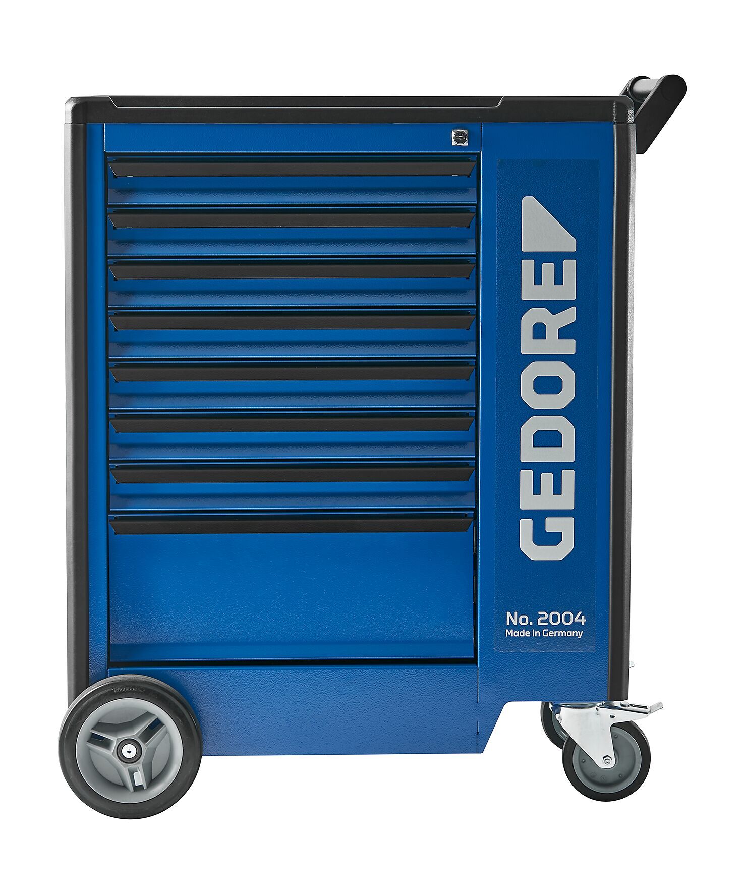 Korpus: Rozmery: výška 985 x šírka 775 x hĺbka 475 mm, Kryt z plastu ABS s 3 nádobami na drobné prvky, vybranie na 2 plechovky a otvory na 8 skrutkovačov, Úložný priestor s obložením z perforovanej ocele (Euro perforácia 10 x 38 mm) a 2 vyberateľnými zásuvkami na drobné súčiastky a dvierkami na strane držadla, Otočný a ľahko ovládateľný vďaka držadlu na jazdu a riadenie, Predná plocha s otvorom Euro 10 x 38 mm na upevnenie hákov a nástrojov, Bezpečnosť prostredníctvom ochrany nôh a protiúderových hrán pre osoby a okolie, Oceľový plech, odolný voči korózii a poškriabaniu, práškovo lakovaný, GEDORE modrý, Zásuvky: Centrálna zámková blokácia s cylindrickým zámkom, Široké zásuvky (šírka 480 x hĺbka 400 mm) s plným výsuvom, vyberateľné, Bezpečnostná blokácia v zásuvke a úložnom priestore, obsluha jednou rukou, Vodiacie koľajnice na guľkových ložiskách, Individuálne vybavenie s pozdĺžnymi a priečnymi priečkami (dodávané aj samostatne), Nosnosť každej zásuvky 40 kg, dolná zásuvka s vyššou odolnosťou 60 kg (nie s č. 2004 1000), Oceľový plech, odolný voči korózii a poškriabaniu, práškovo lakovaný, GEDORE modrý, Vysoko odolné zavesenie GEDORE: Celková statická nosnosť 1000 kg (750 kg dynamická), 2 kolesá s vysokou účinnosťou s valčekovými ložiskami GEDORE (pevné kolieska Ø 200 mm), 2 ľahko pohyblivé kolesá s guľkovými ložiskami GEDORE (otočné kolieska Ø 125 mm), obe s plnou blokáciou, Konštrukcia osi GEDORE funguje aj pri maximálnom zaťažení: ľahkosť pohybu, obratnosť a istota vedenia po nerovnostiach, Vybavenie: Pozdĺžne (PW) a priečne (PP) priečky z pozinkovanej ocele (možno objednať aj samostatne), Možnosti: Môže byť optimálne vybavený nástrojovými modulmi GEDORE (č. 1500 ES/1500 CT), Ľubovoľne rozšíriteľný pomocou nasadzovacích boxov na nástroje, zadných stien a nástrojových skriniek GEDORE, Ďalšie varianty zásuviek na požiadanie, Špeciálne farby a verzie na dopyt, Dodávka bez zobrazených nástrojov a príslušenstva