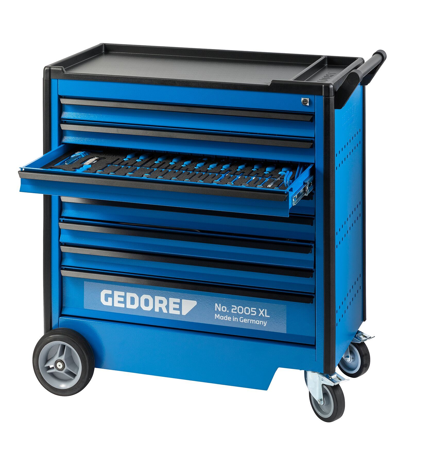 Plne vybavený náradový vozík pre rýchle, organizované a efektívne opravy a údržbu v každodennej dielenskej práci, náradie v metrických rozmeroch, so systémom GEDORE Check-Tool: kontrola kompletnosti pomocou dvojfarebných vložiek z peny, odolné voči olejom a tukom, v náradovom vozíku č. 2005 XL s 8 zásuvkami, celková nosnosť 1000 kg staticky, 750 kg dynamicky, 8 extra širokých zásuviek (Š 792 x H 400 mm), nosnosť na zásuvku 60 kg, dolná zásuvka s vysokou nosnosťou 70 kg, jazdný systém: trapezová konštrukcia osi GEDORE zabezpečuje aj pri maximálnom zaťažení: ľahkú jazdu, obratnosť a udržanie smeru.