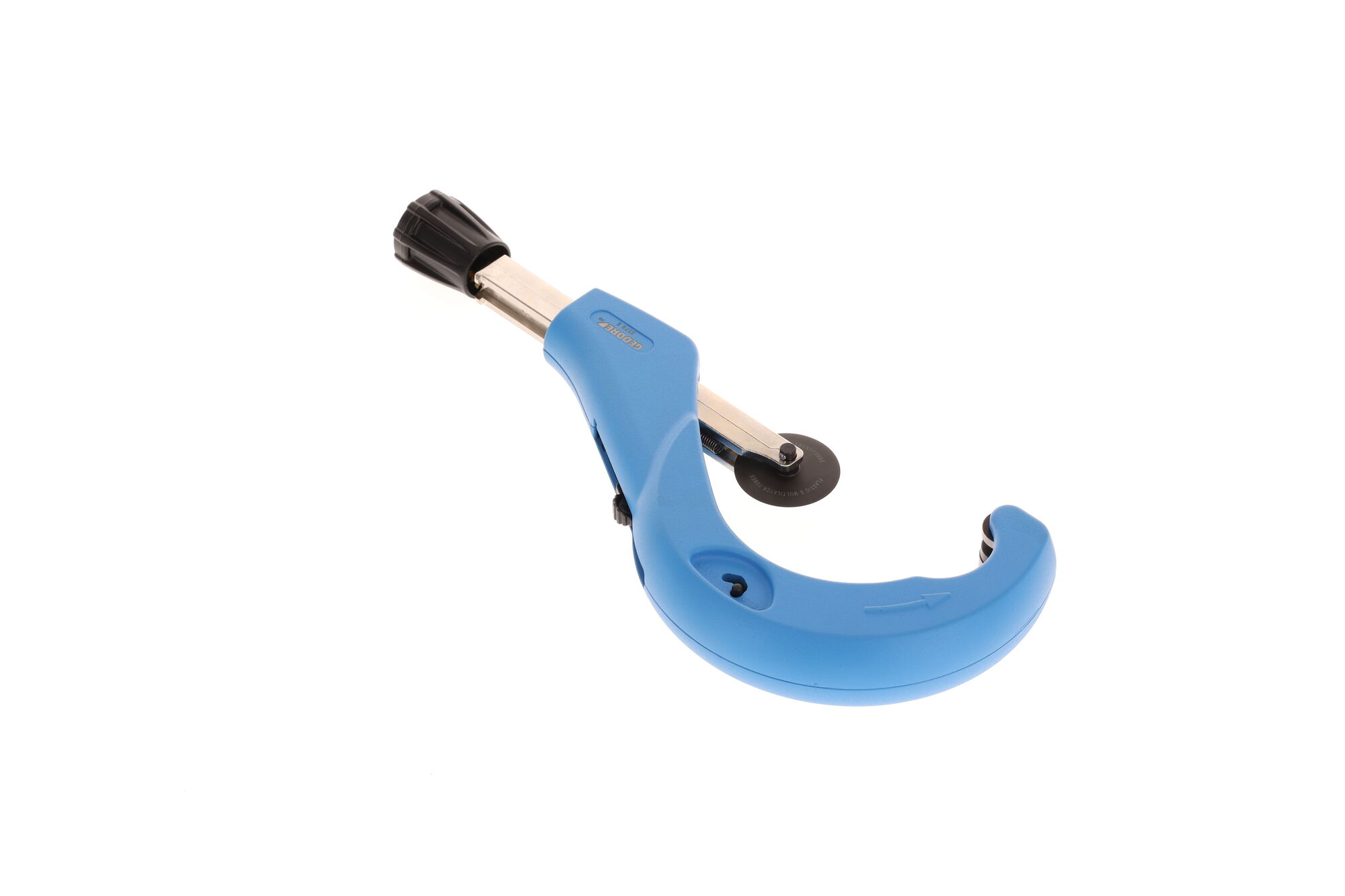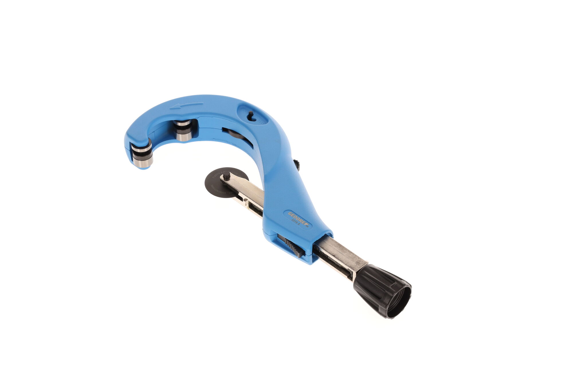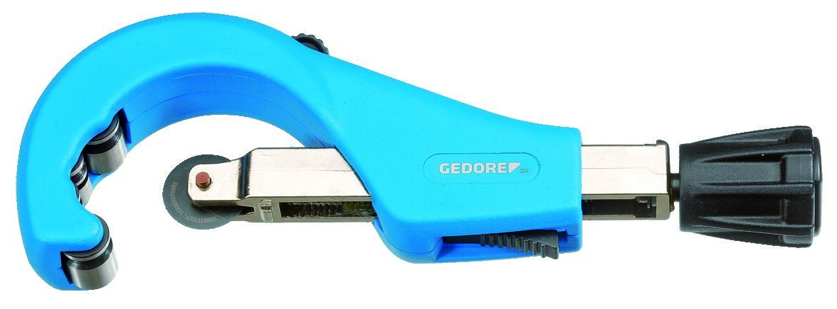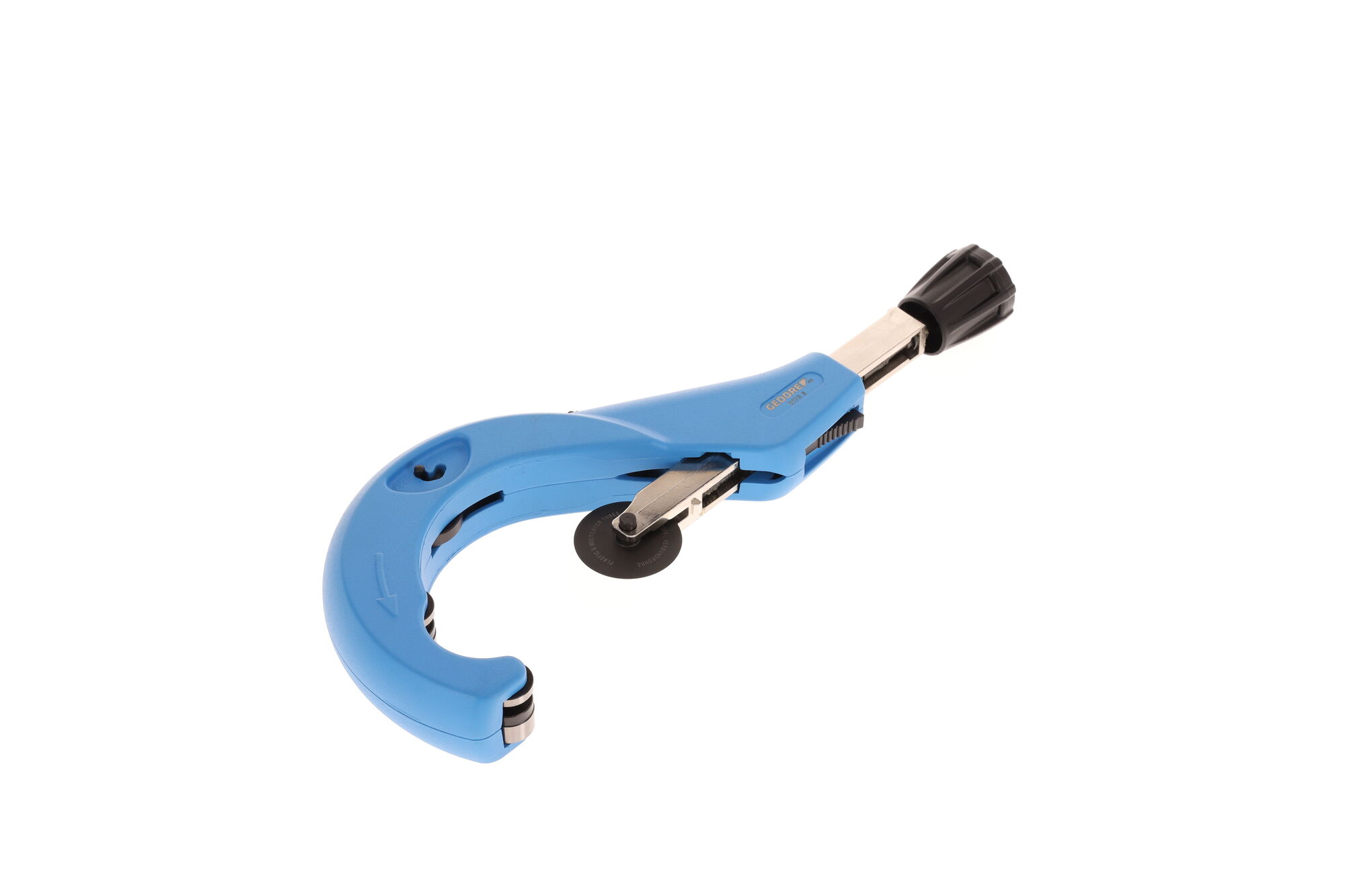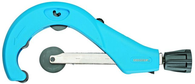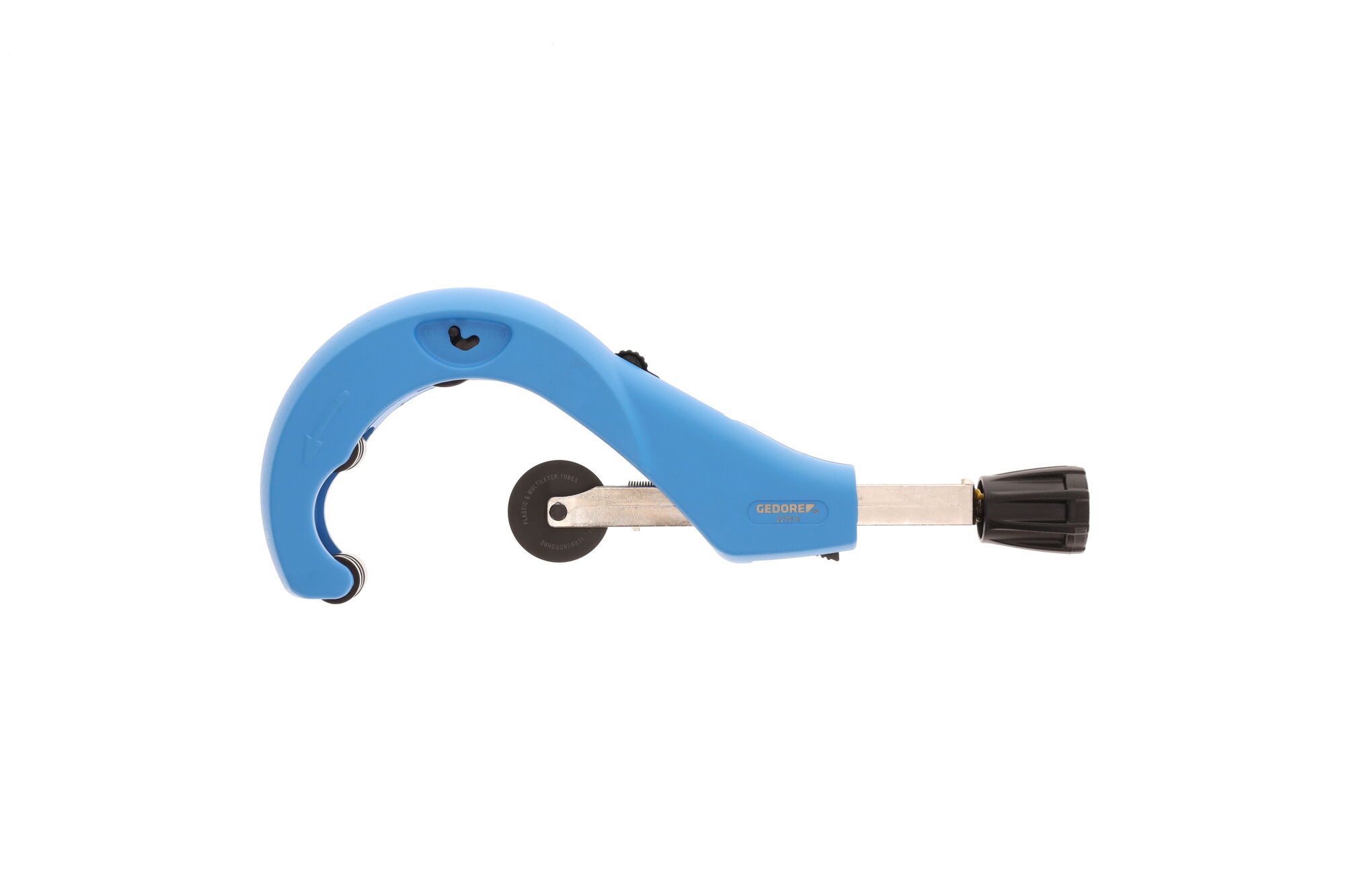 Na čisté rezanie viacvrstvových kompozitných rúr (MSR) a iných rúr z plastov, Systém rýchlej výmeny rezných kotúčov bez použitia náradia, So zabudovaným odhrotovačom a náhradným rezným kotúčom v držiaku, Č. 2270 5 s nastaviteľným tretím tlakovým valčekom pre optimálne vedenie rôznych rozmerov rúr, S rýchlym nastavením, Telo z tlakovo liateho hliníka, Nastriekané na modro