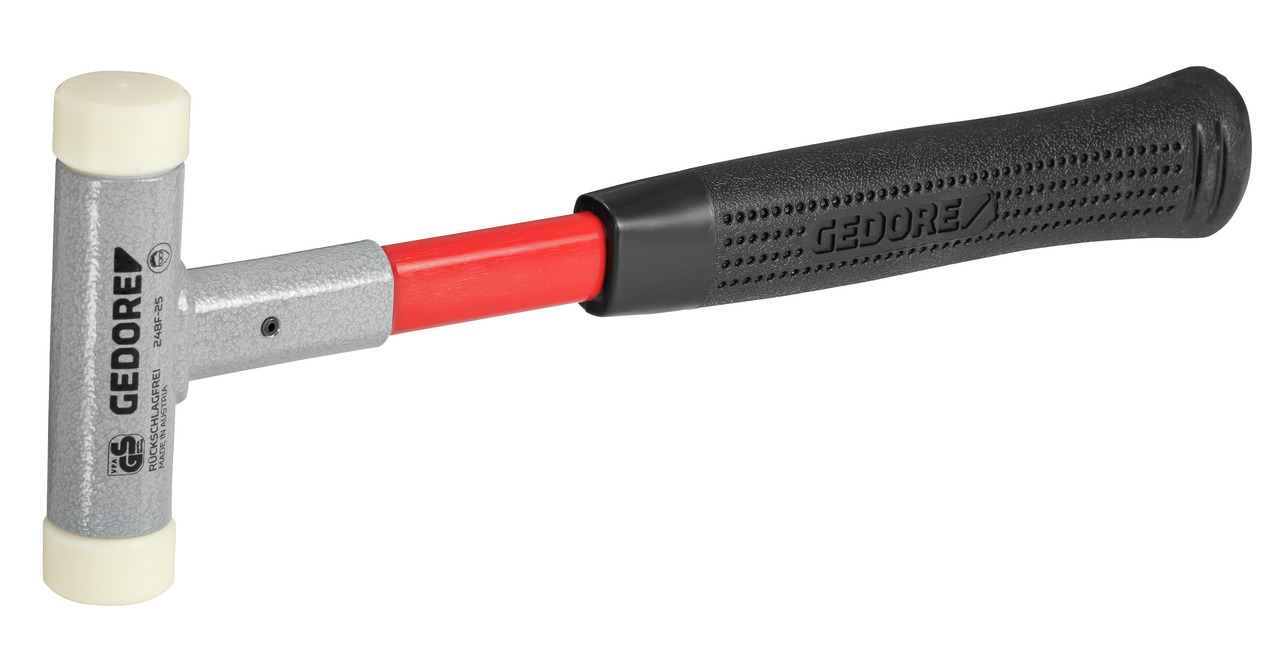 Takmer nerozbitná rukoväť z sklených vlákien s plastovým úchopom a ochranou hlavy, bezodpryskovo, ťažko lámavé a ťažko opotrebovateľné polyamidové hlavy, 75 Shore D, testované do -20° C, strieborné kladivkové práškové lakovanie
