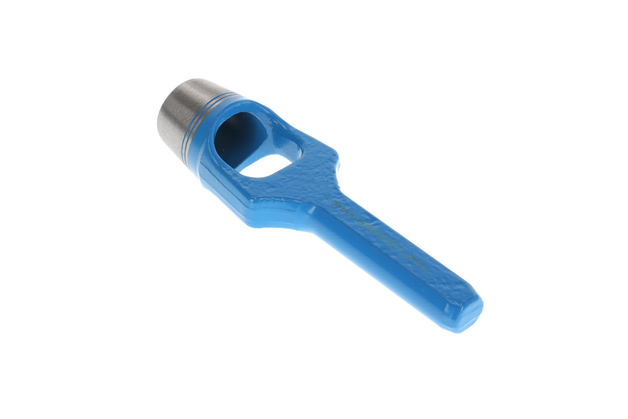 Konstrukcia podľa DIN 7200 forma A, Na vysekávanie kartónu, kože, gumy, tesniacich materiálov a iných mäkkých materiálov, Úzka hlava klieští na ťažko prístupné miesta, Rúčka lakovaná na modro