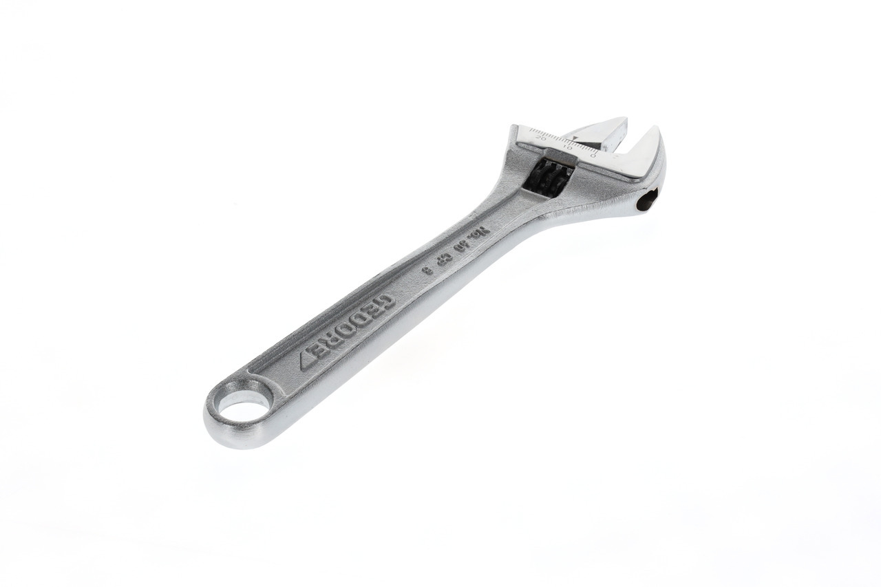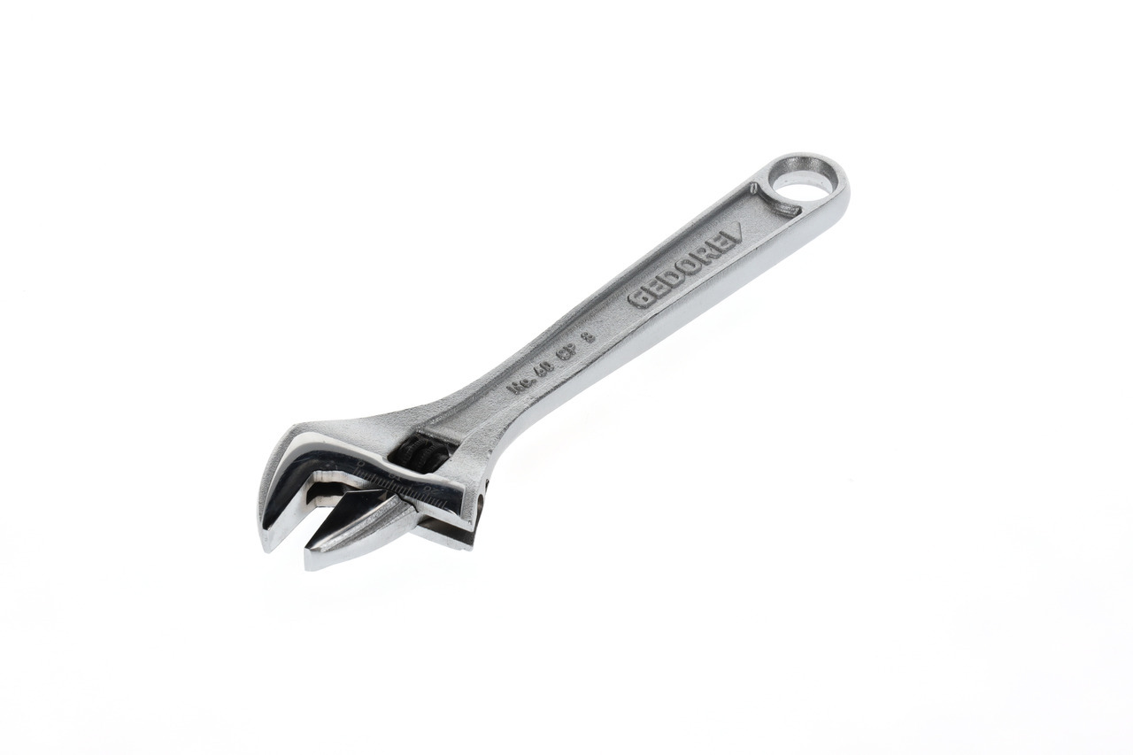 Vykonanie podľa ISO 6787, Pozícia čeľuste 15°, Švédsky model, valček s ľavostranným pohonom, So škálou nastavení, Oceľ chrómovo-vanádiová, Chrómované, leštené hlavy, Chrómované, S otvorom na zavesenie