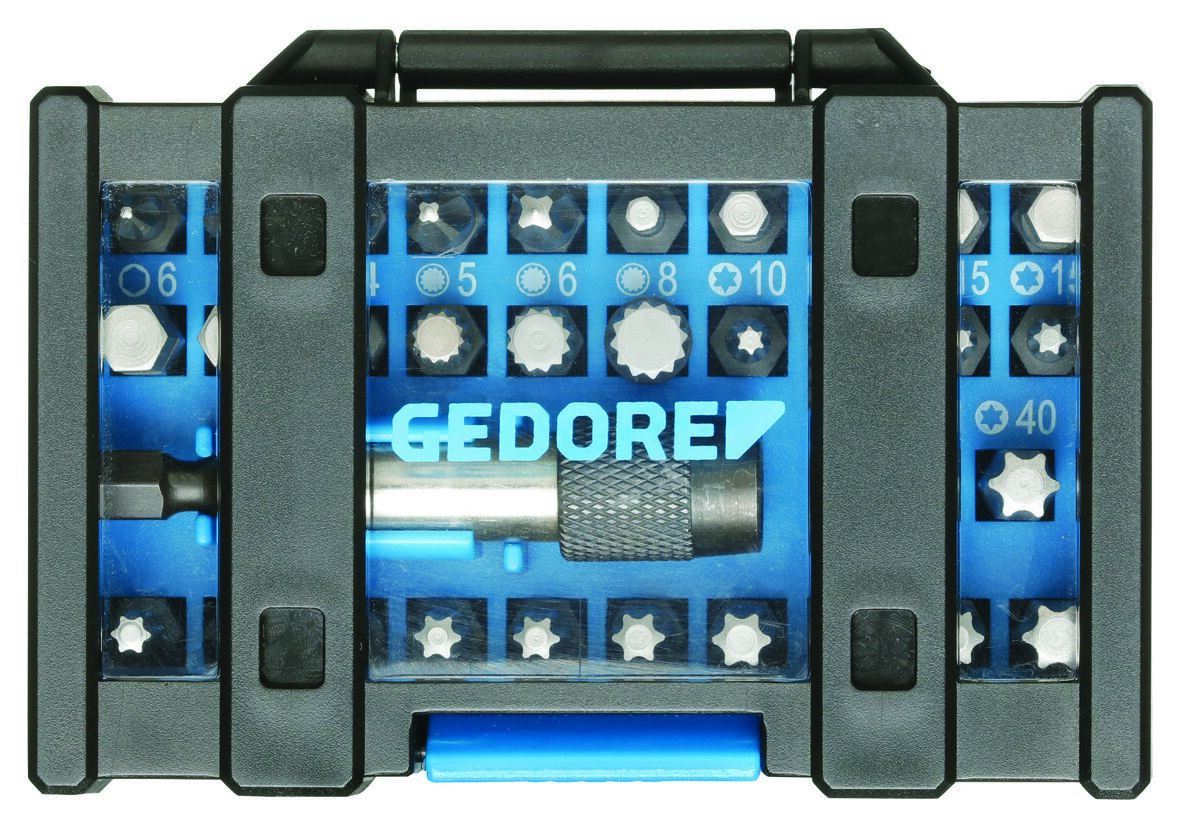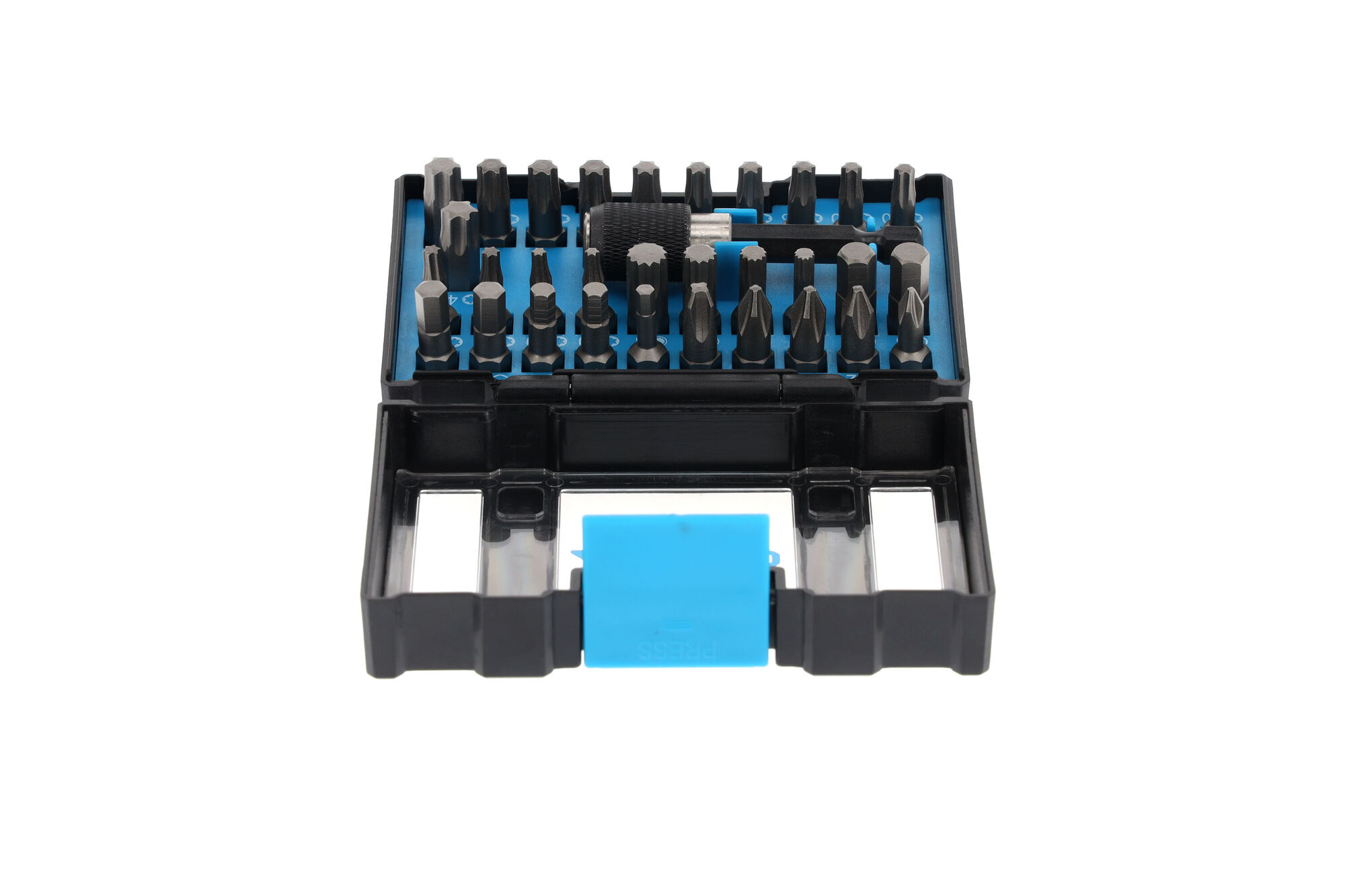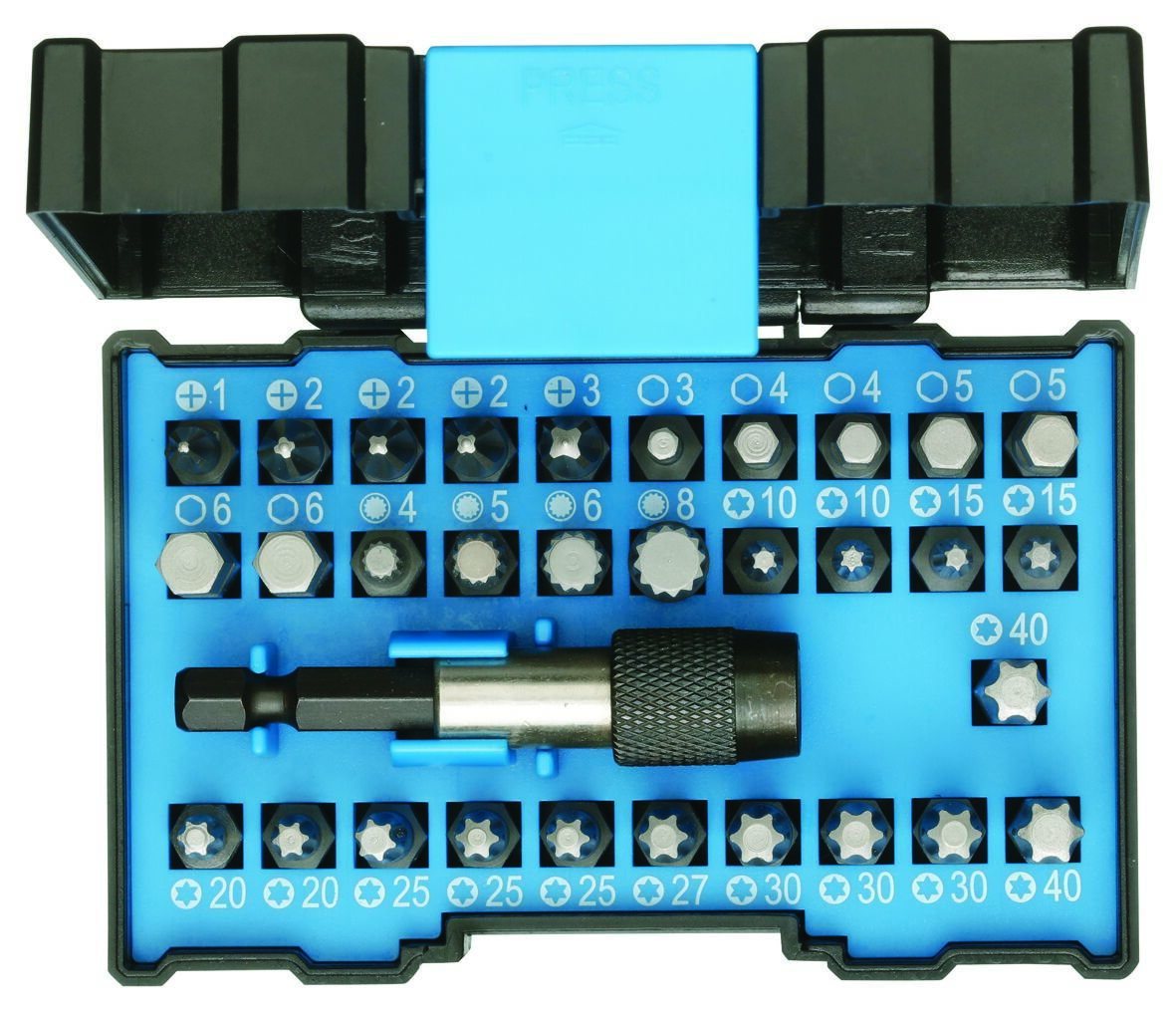 - Zoznam častí (text): PH 1 (1x) PH 2 (3x) PH 3 (1x) TX T10 (2x) T15 (2x) T20 (2x) T25 (3x) T27 (1x) T30 (3x) T40 (2x) 3 (1x) 4 (2x) 5 (2x) 6 (2x) XZN M4 (1x) M5 (1x) M6 (1x) M8 (1x) Adaptér 1/4"-1/4"