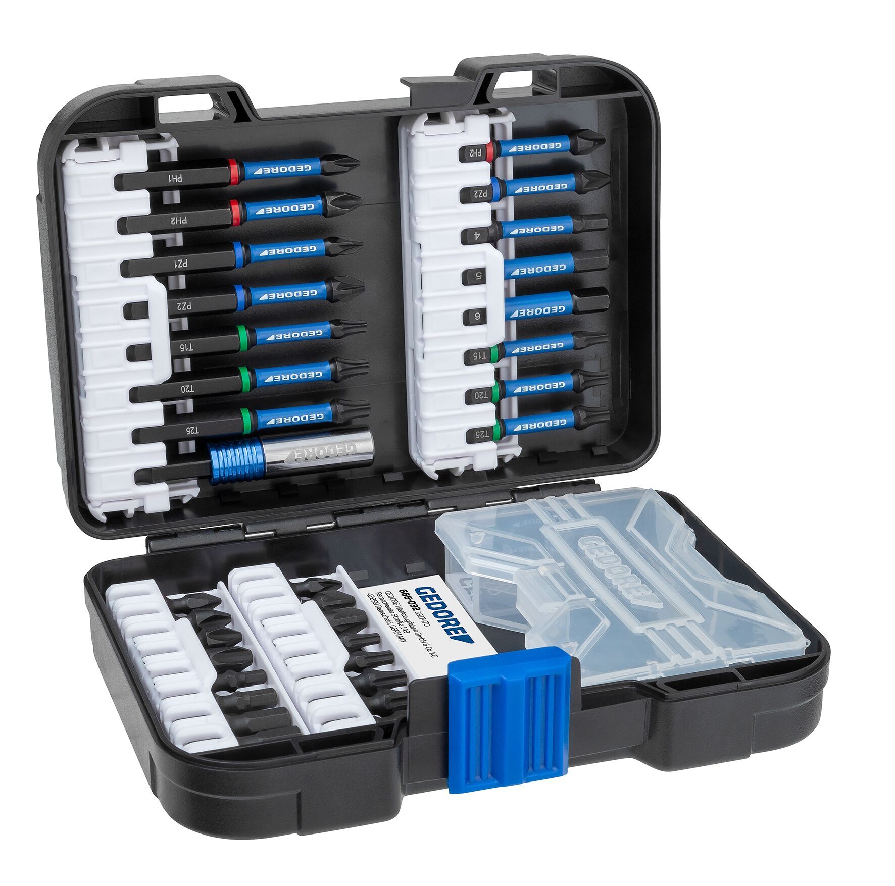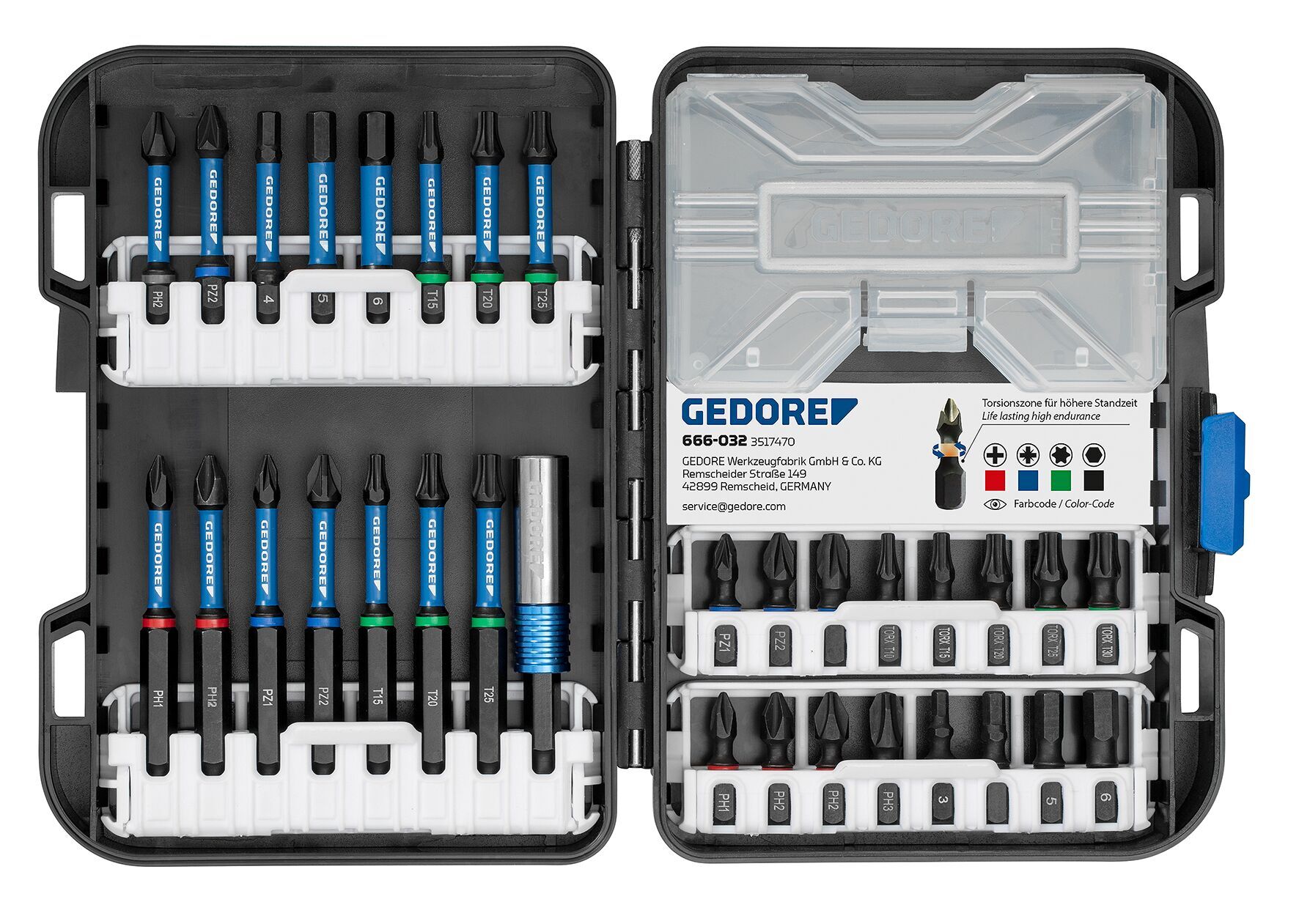 Sada skrutkových bitov 32-dielna, 16 skrutkových bitov (25 mm) v profiloch PH, PZ, TX, IN, 8 skrutkových bitov (50 mm) v profiloch PH, PZ, TX, IN, 7 skrutkových bitov (75 mm) v profiloch PH, PZ a TX, označenie Color-Code (jednotný farebný systém ako v sadách 666-042 a 666-045), držiak na bity 1/4" One-touch Slim Lock L.66,5, moduly nosičov bitov otočné o 45° + 90°, vrátane vnútorného boxu na uskladnenie malých častí, v kompaktnom plastovom kufríku.