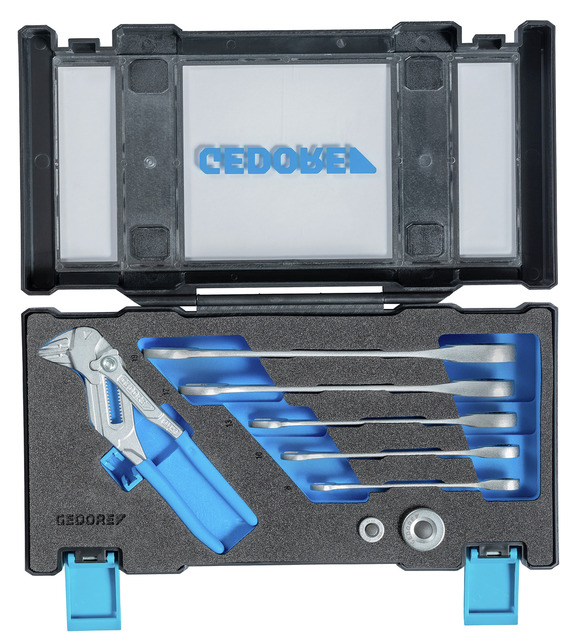 Flexibilita tam, kde je priestor obmedzený, Plná verzia, Praktická kompilácia, S profilom UD, S pohonným adaptérom pre vložky 1/4" a 1/2", V súprave kľúč kombinovaný veľkosť 7 (do 0 - 42 mm / 0" - 1 5/8"), S priloženými ochrannými čeľusťami na jemné povrchy
