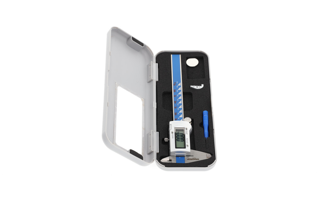Konstrukcia podľa DIN 862, Nerezová oceľ, kalená, Možnosť prepínania z milimetra na palec, Merací rozsah: 0 - 150 mm/6", S výstupom dát (Mini-USB), Nulová pozícia v akejkoľvek pozícii, Meracie hroty jemne brúsené a leštené, Veľký LCD displej (výška číslic 9 mm), Môže byť používaný s palcovým kolieskom alebo bez (náhradná časť bez palcového kolieska na samostatnú montáž je dodávaná), V stabilnom plastovom puzdre