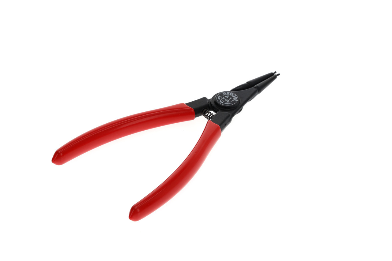 Pre prechody zabezpečujúce podľa DIN 471, DIN 983, Konštrukcia podľa DIN 5254 forma A, Priame čeľuste, So otváracou pružinou, So zabezpečením upínania, Kovaná GEDORE chróm-vanádiová špeciálna oceľ kalená a popúšťaná, Presne opracované, kalené v oleji a popúšťané, Čierna, s modrými, ponorenými rukoväťami