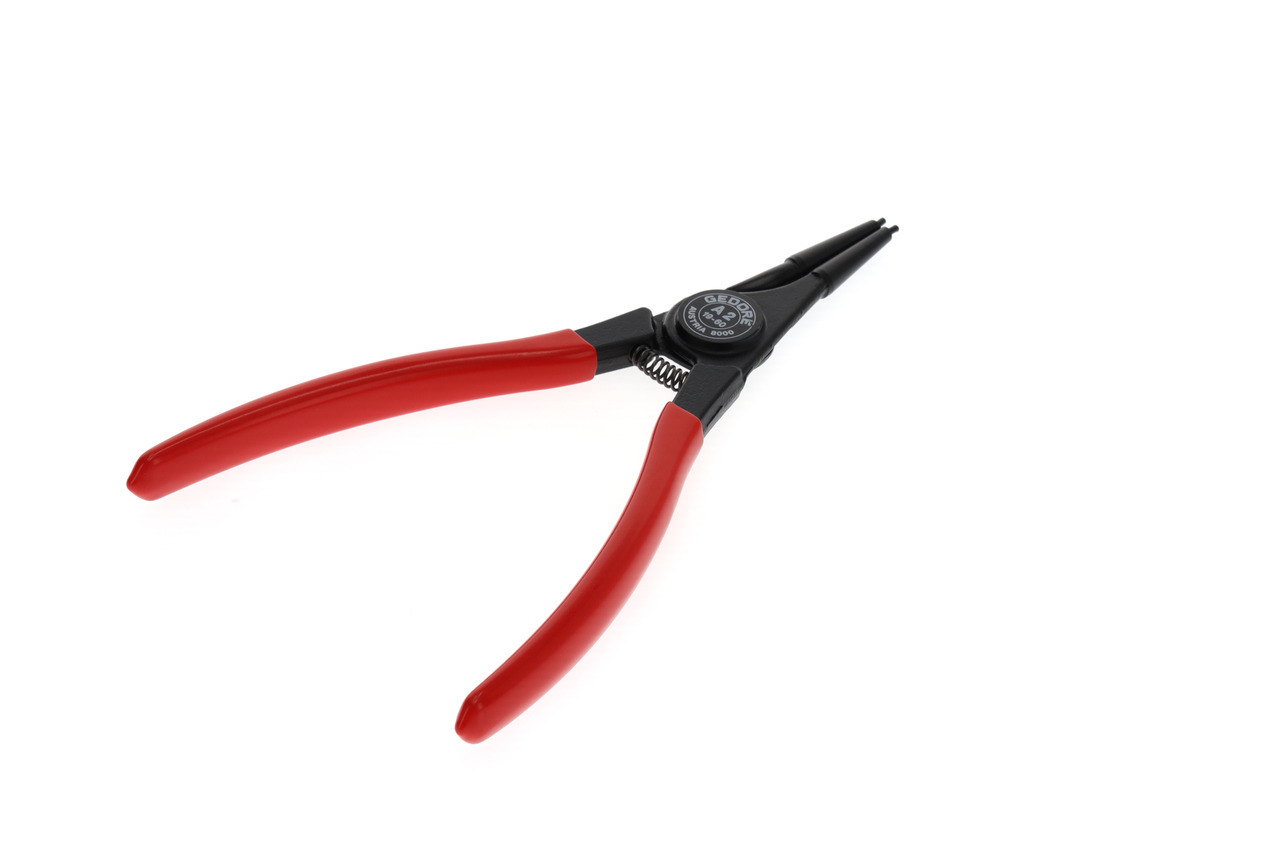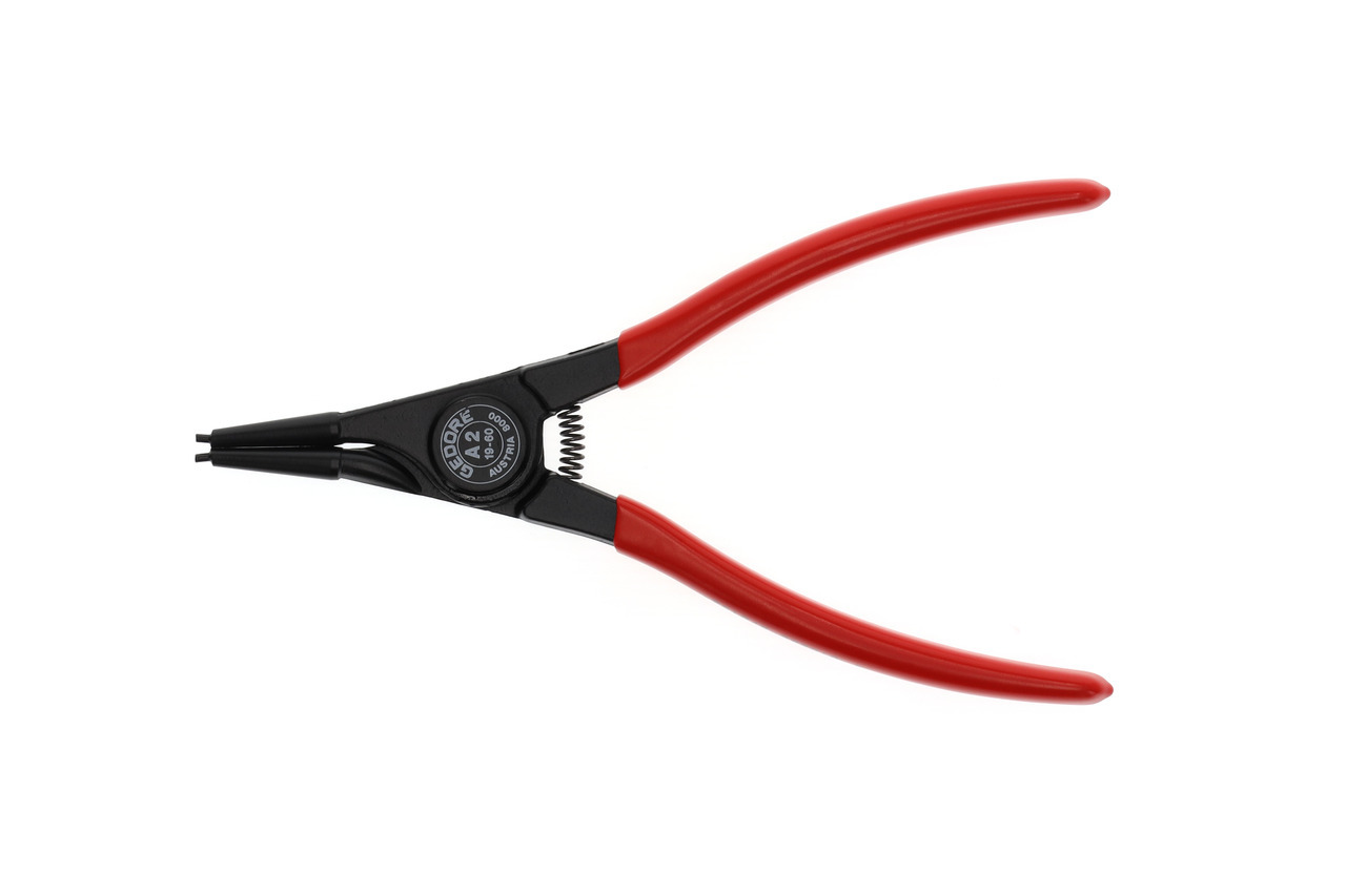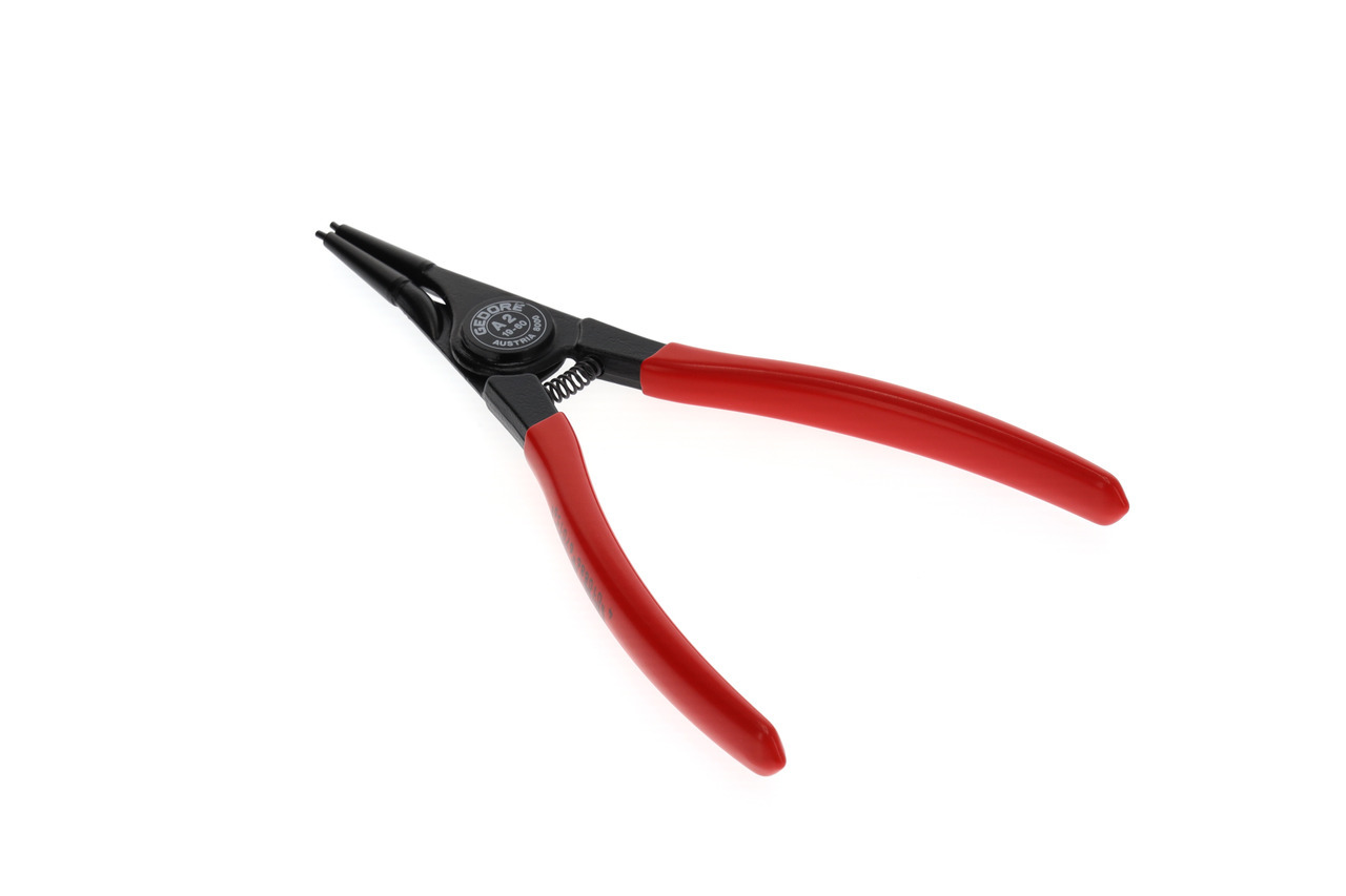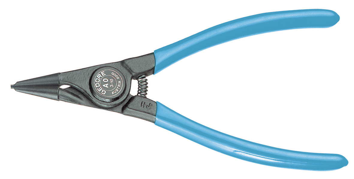 Pre uzamykacie krúžky podľa DIN 471, DIN 983, Konštrukcia podľa DIN 5254 forma A, Priame čeľuste, So otváracou pružinou, S upínacím zabezpečením, Kovaná GEDORE chróm-vanádiová špeciálna oceľ kalená a popúšťaná, Presne opracované, kalené v oleji a popúšťané, Čierne, s modrými, ponorenými rukoväťami
