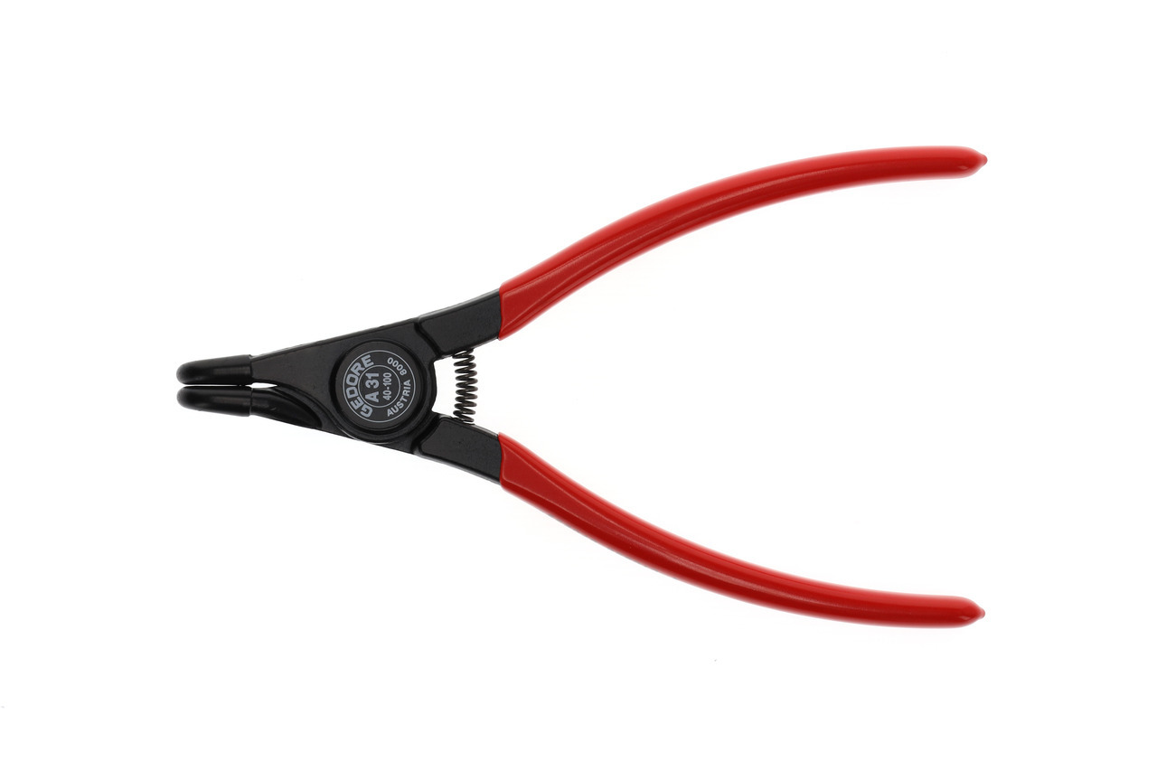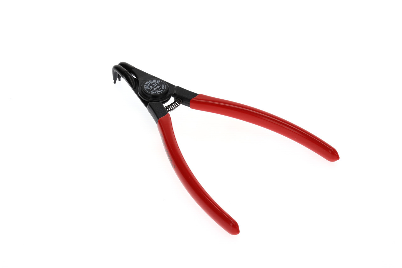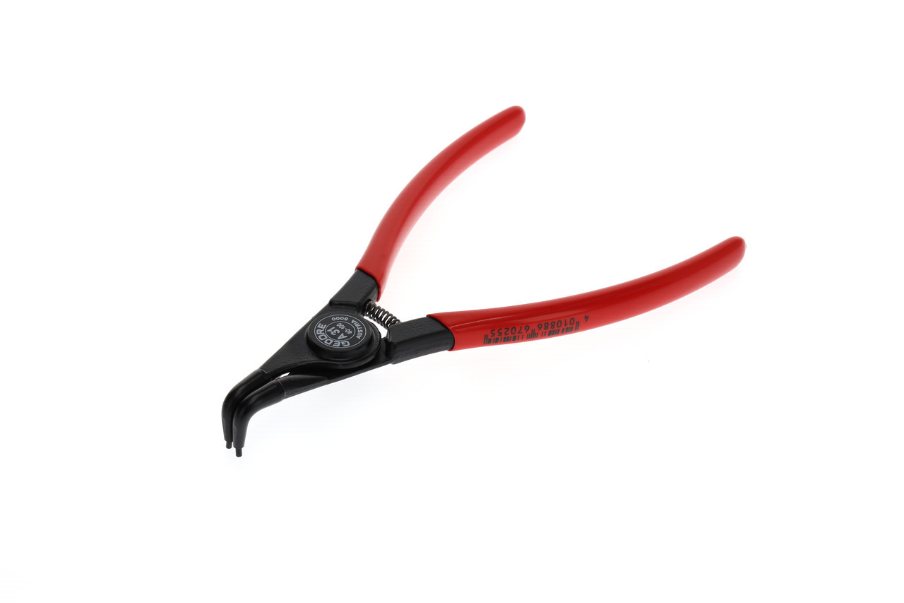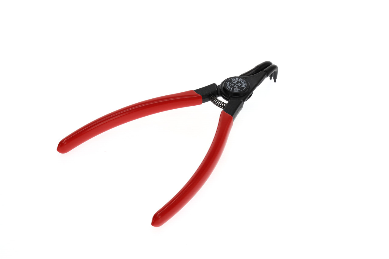 Dla krúžkov zabezpečujúcich podľa DIN 471, DIN 983, Konštrukcia podľa DIN 5254 forma B, Čeľuste pod uhlom 90°, So otváracou pružinou, So zaisťovacím upínaním, Kovaná GEDORE chróm-vanádiová špeciálna oceľ kalená a popúšťaná, Presne opracované, kalené v oleji a popúšťané, Čierna, s modrými, ponorenými rukoväťami