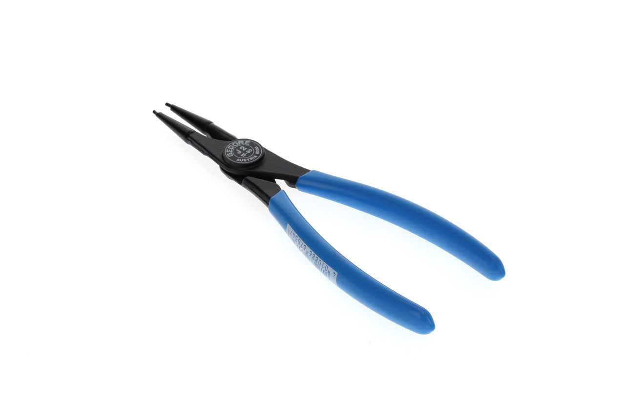 Pre prechodné krúžky podľa DIN 472, DIN 984, Konštrukcia podľa DIN 5256 forma C, Hladké čeľuste, Kovaná GEDORE chrómovo-vanádiová špeciálna oceľ kalená a popúšťaná, Presne opracované, kalené v oleji a popúšťané, Čierna, s modrými, ponorenými rukoväťami