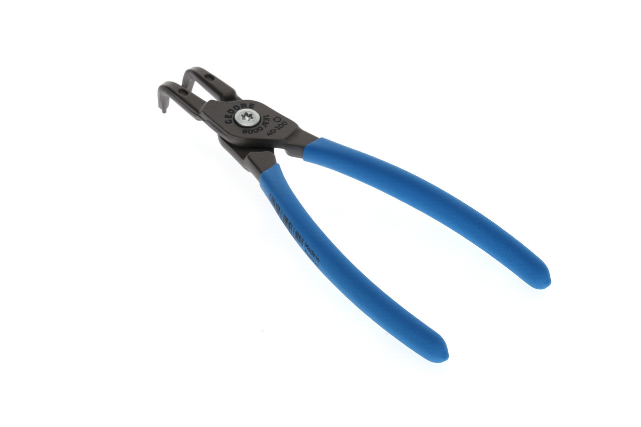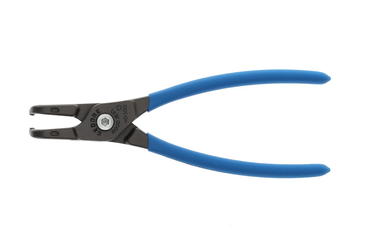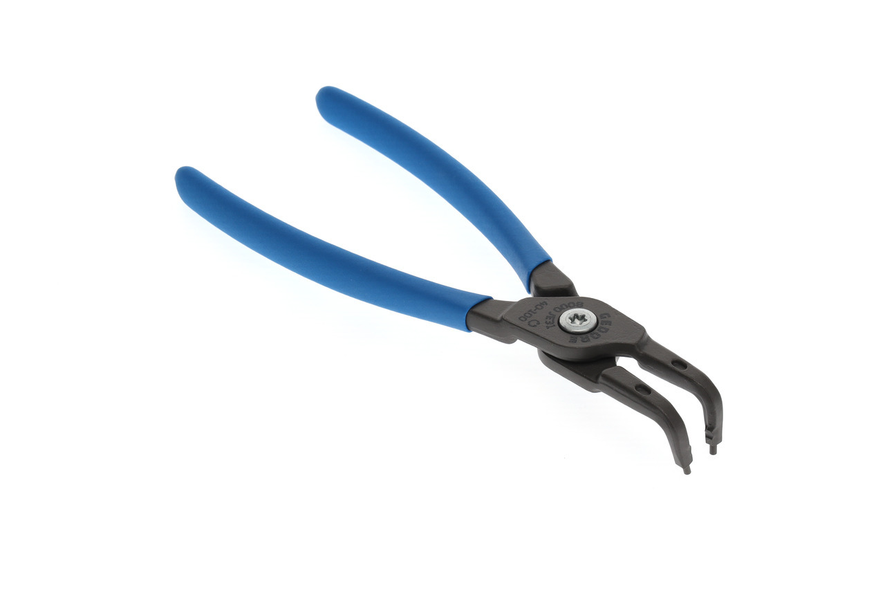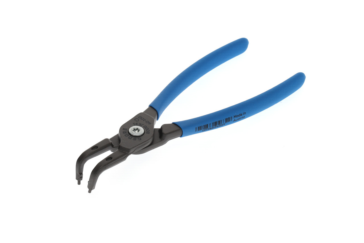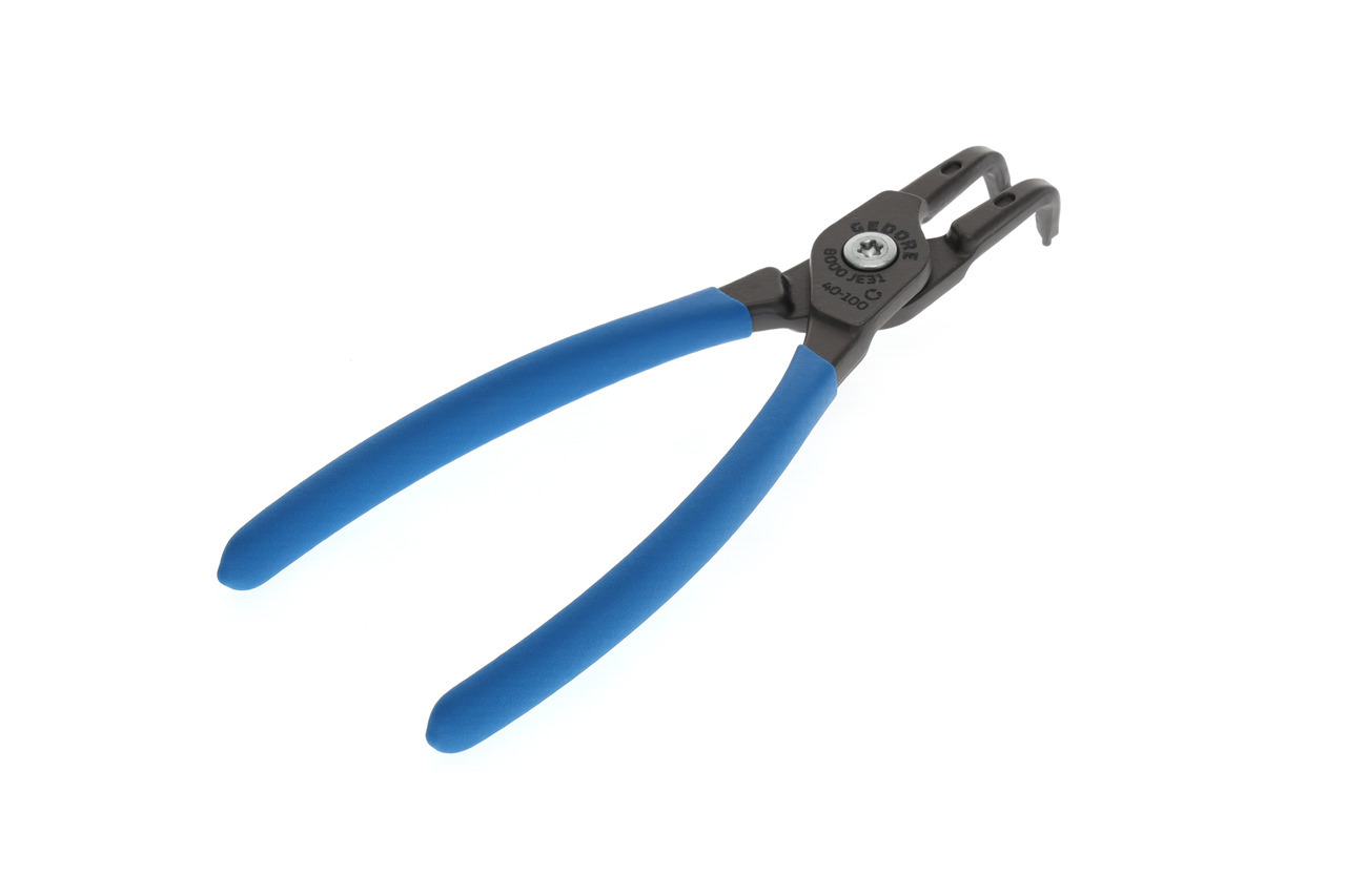 Pre zabezpečovacie krúžky podľa DIN 472, DIN 984, Konštrukcia podľa DIN 5256 forma D, Čeľuste pod uhlom 90°, Telo klieští zo špeciálnej chrómovo-vanádiovej ocele GEDORE podrobenej tepelnej úprave, Vytláčané koncovky vyrobené z veľmi odolnej proti opotrebeniu ocele ložiskovej, Odolná voči skrúteniu geometria koncovky, Skrutkový spoj, Oceľovošedá, s protišmykovými rukoväťami ponorenými