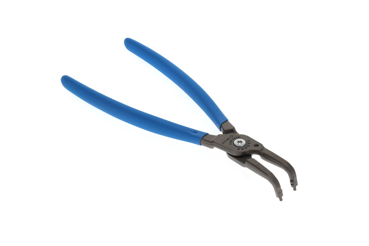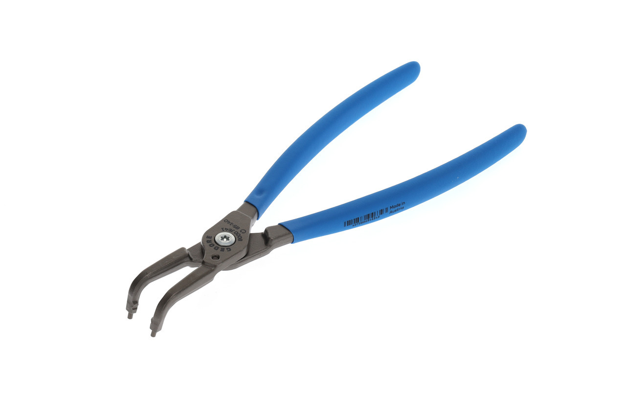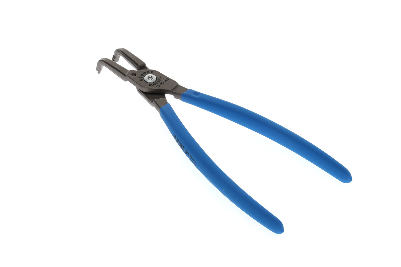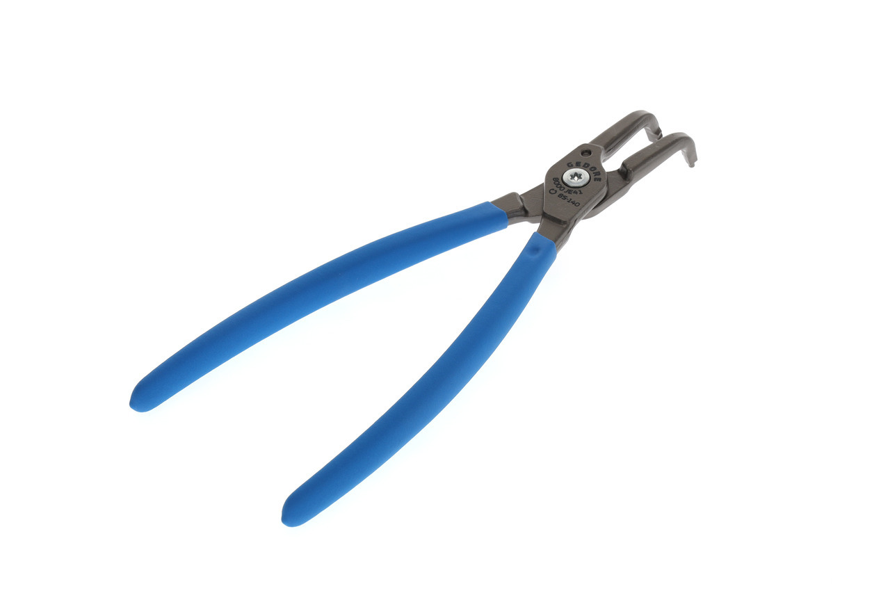 Pre zabezpečovacie krúžky podľa DIN 472, DIN 984, Konštrukcia podľa DIN 5256 forma D, Čeľuste pod uhlom 90°, Telo klieští zo špeciálnej chrómovo-vanádiovej ocele GEDORE podrobenej tepelnej úprave, Vytláčané koncovky vyrobené z veľmi odolnej proti opotrebeniu ocele ložiskovej, Odolná proti skrúteniu geometria koncovky, Skrutkové spojenie, Oceľovošedá, s protišmykovými rukoväťami ponorenými