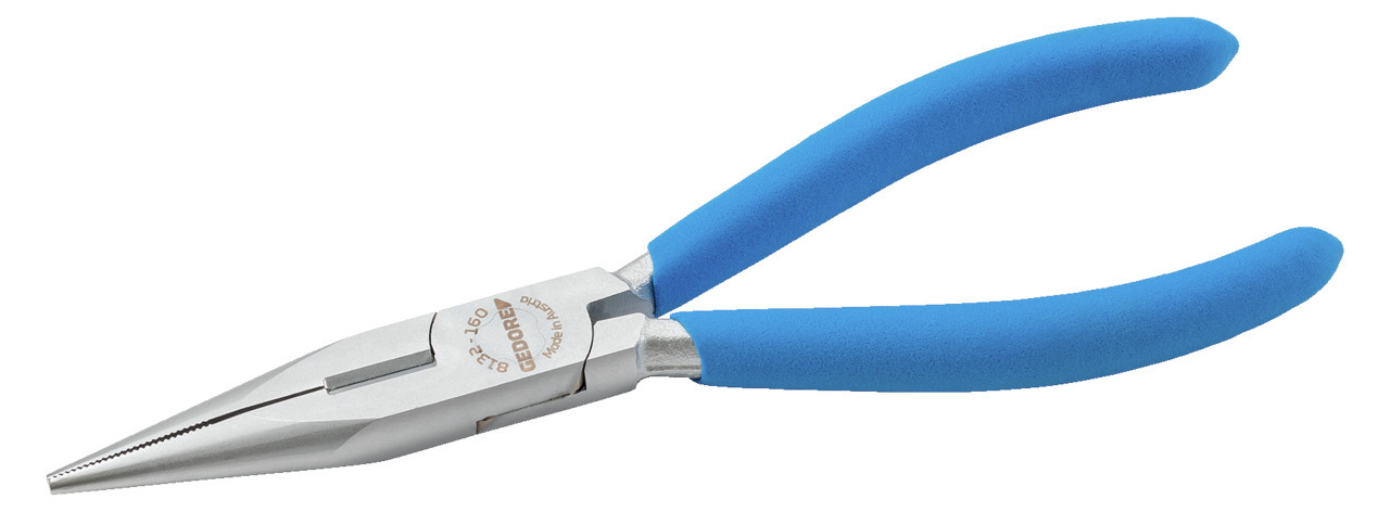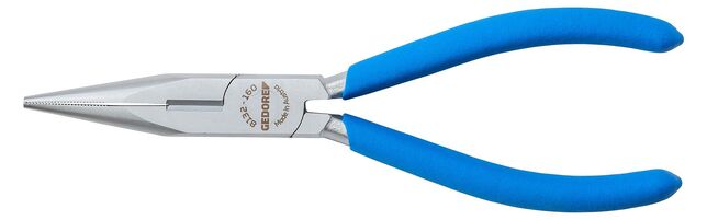 Vykonanie podľa DIN ISO 5745, ploché-okrúhle, dlhé čeľuste, rovné uchopovacie plochy, zúbkované, na držanie, uchopenie, ohýbanie a rezanie, indukčne kalené presné ostria, tvrdosť ostrí 61 - 63 HRC, špeciálna oceľ GEDORE na zlepšenie, kovaná v matrice, kalená v oleji a popúšťaná, vykonanie JC = chrómané, s 2-zložkovým poťahom úchopov, vykonanie TL = lakovanie bezfarebným lakom, s modrými krytmi úchopu natieranými ponorením