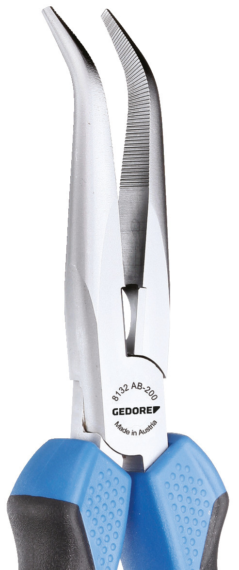 Podobne do DIN ISO 5745, ploché-okrúhle dlhé čeľuste, ohnuté úchopové plochy, zúbkované, Ohýbané o 45° konce umožňujú uchopenie na ťažko prístupných miestach, Indukčne kalené presné ostria, tvrdosť ostrí 61 - 63 HRC, Špeciálna oceľ GEDORE na zlepšenie, kovaná v matrici, kalená v oleji a popúšťaná, Vyhotovenie JC = chrómované, s 2-zložkovým poťahom úchopov, Vyhotovenie TL = bezfarebné lakovanie, s modrými krytmi úchopu natieranými ponorením, Model TC = chrómovaný, s modrými ponorenými úchopmi