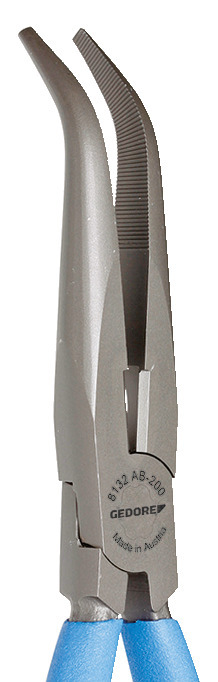 Podobne do DIN ISO 5745, Plocho-kruhové dlhé čeľuste, ohnuté úchopové plochy, zúbkované, Ohnuté o 45° konce umožňujú uchopenie na ťažko prístupných miestach, Indukčne kalené presné čepele, tvrdosť čepelí 61 - 63 HRC, Špeciálna oceľ GEDORE na zlepšenie, kovaná v matrice, kalená v oleji a popúšťaná, Vyhotovenie JC = chrómané, s 2-zložkovým poťahom úchopov, Vyhotovenie TL = bezfarebné lakovanie, s modrými krytmi úchopu natieranými ponorením, Model TC = chrómané, s modrými ponorenými úchopmi