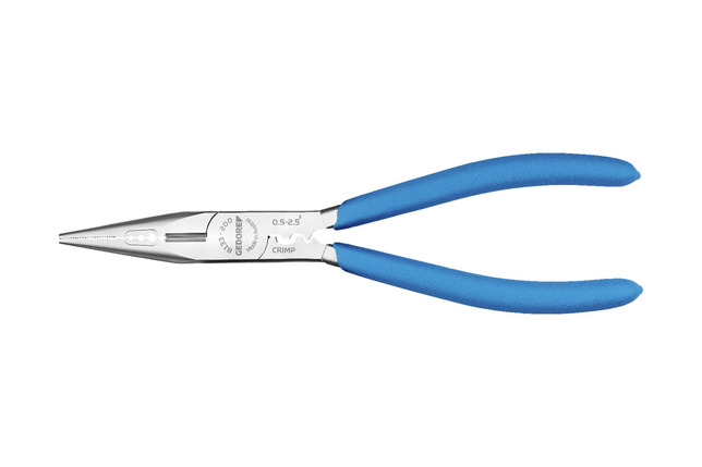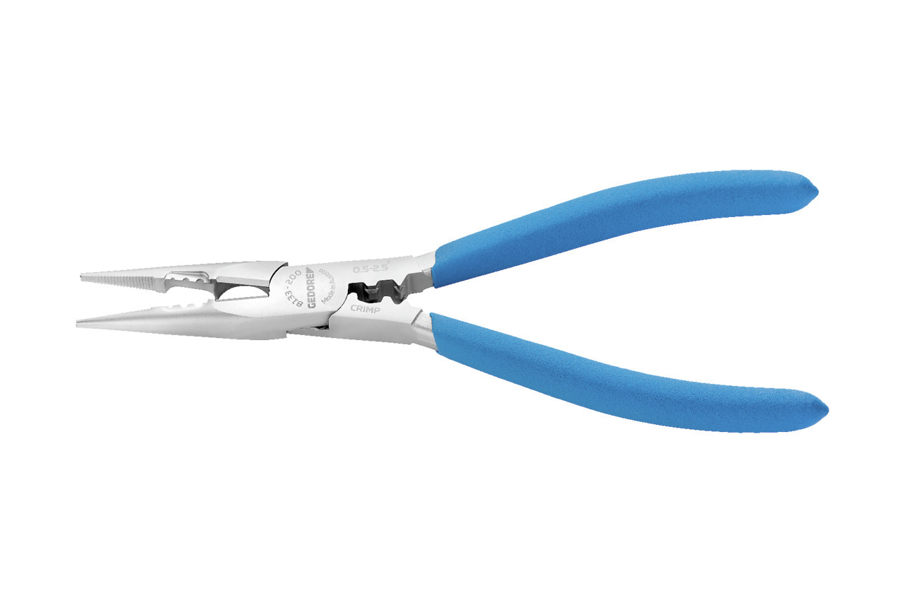 Viacúčelové kliešte na použitie v mechanickej a elektronickej oblasti, Držanie, rezanie, odizolovanie, lisovanie, drvenie, Plocho-kruhové čeľuste, rovné uchopovacie plochy, zúbkovanie, Indukčne kalené presné ostria, tvrdosť ostrí 62 - 64 HRC, Pre stredne tvrdý drôt 1,6 mm, Špeciálna oceľ GEDORE na zlepšenie, kovaná v matrice, kalená v oleji a popúšťaná, Na odizolovanie káblov od 0,5 do 2,5 mm², Špeciálna oceľ GEDORE na zlepšenie, kovaná v matrice, kalená v oleji a popúšťaná, Rezné hrany dodatočne indukčne kalené, Verzia JC = chrómaná, s dvojkomponentnými rukoväťami, Verzia TL = oceľovo šedá, s modrými ponorenými protišmykovými rukoväťami, Model TC = chrómaný, s modrými ponorenými rukoväťami