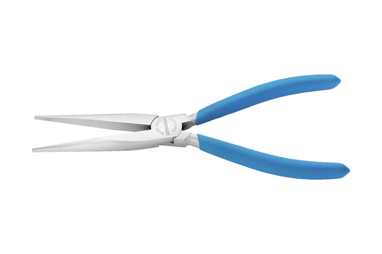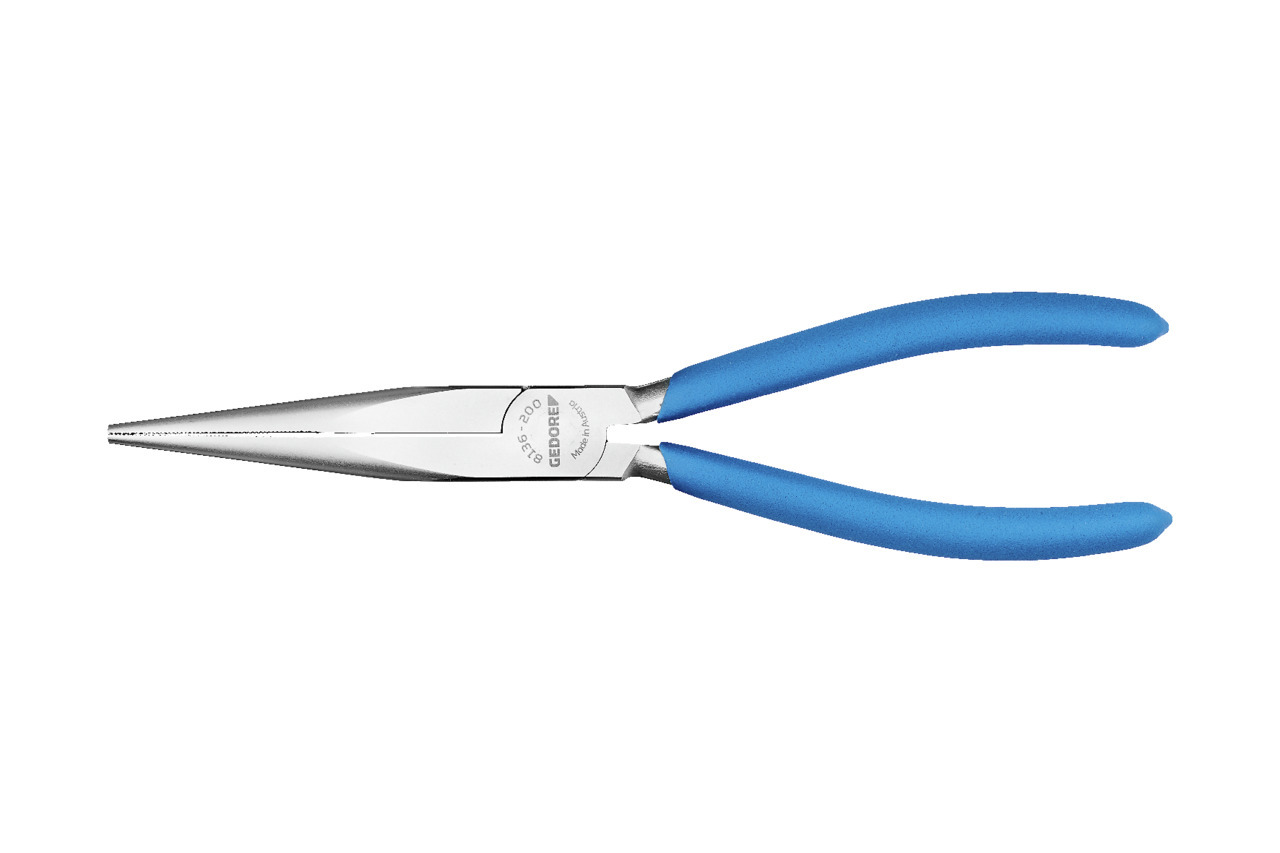 Vyhotovenie podľa DIN ISO 5745, Čeľuste ploché-okrúhle, priečne zúbkované uchopovacie plochy, Na práce súvisiace s držaním, uchopením a ohýbaním, S jemným hrotom, na bezpečnú prácu aj v obmedzených priestoroch, Špeciálna oceľ GEDORE na zlepšenie, kovaná v matrice, kalená v oleji a popúšťaná, Vyhotovenie JC = chrómované, s 2-zložkovým poťahom úchopov, Vyhotovenie TL = lakovanie bezfarebným lakom, s modrými krytmi úchopu natieranými ponorením, Model TC = chrómovaný, s modrými ponorenými úchopmi