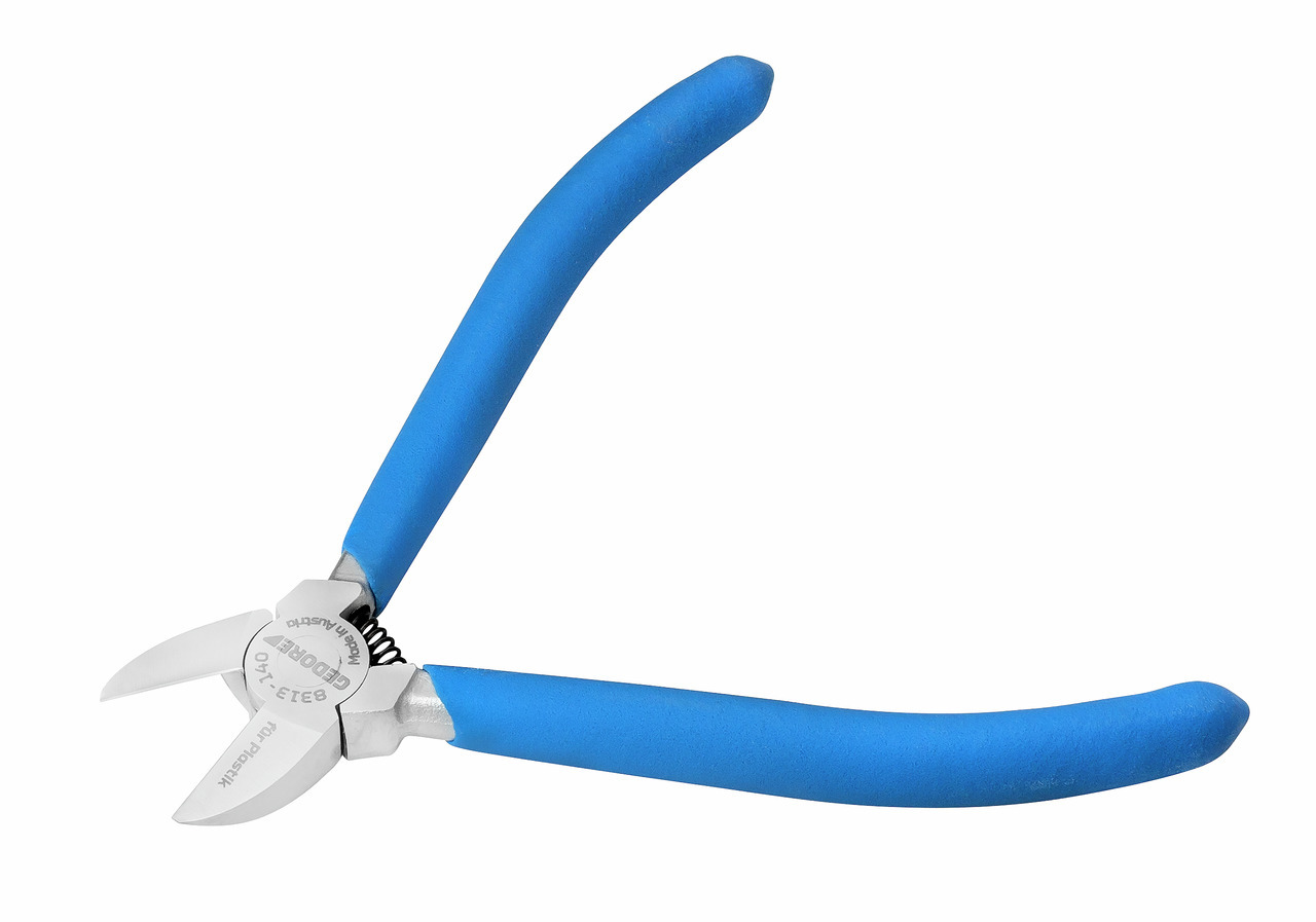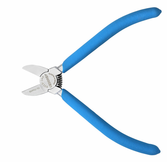 Bez skosov na hladké rezanie častí z plastov alebo podobných mäkkých materiálov, čierny, rezné plochy ploché brúsené, samovoľne otvárané pomocou tlakovej pružiny, čierny, hlava brúsená s modrými, ponorenými, protišmykovými rukoväťami, len pre plast, model TC = chrómovaný, s modrými ponorenými rukoväťami