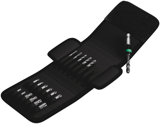 - S univerzálnym držiakom Rapidaptor, skrutkovité vrtáky s upínacím šesťhranom 1/4" do kovu a bity s pripojovacím rozmerom 1/4"