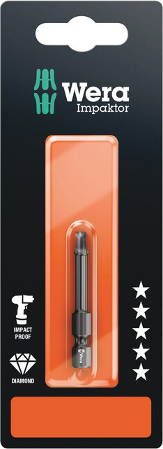 Vyhotovenie: Technológia Impaktor zabezpečuje najlepšie možné využitie vlastností materiálu a vďaka optimálne prispôsobenej geometrii nadpriemernú životnosť aj pri extrémnych podmienkach; zvlášť vhodné na použitie s bežne predávanými skrutkovačmi Impakt/rázovými skrutkovačmi; drsná diamantová povrchová vrstva vďaka zvýšenému odporu trením znižuje riziko vyklznutia zo skrutky