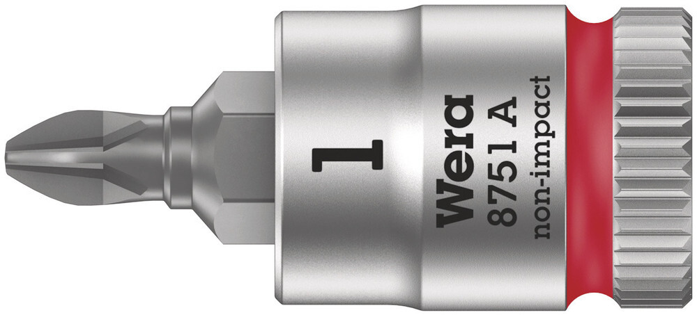 Vyhotovenie:K ručnému a strojného ovládaniu (non impact), so záchytnou drážkou guľôčky, ryhovanie na zadnom konci pre vysokú priľnavosť pri ručnom ovládaní; zástrčné nástavce s prednosťami technológie Wera Bit, matne chrómované. Farebné označenie profilu (červená = Phillips) a číselné označenie veľkosti pre jednoduché nájdenie požadovaného zástrčného nástavca.