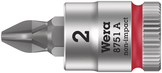 Vyhotovenie:K ručnému a strojného ovládaniu (non impact), so záchytnou drážkou guľôčky, ryhovanie na zadnom konci pre vysokú priľnavosť pri ručnom ovládaní; zástrčné nástavce s prednosťami technológie Wera Bit, matne chrómované. Farebné označenie profilu (červená = Phillips) a číselné označenie veľkosti pre jednoduché nájdenie požadovaného zástrčného nástavca.