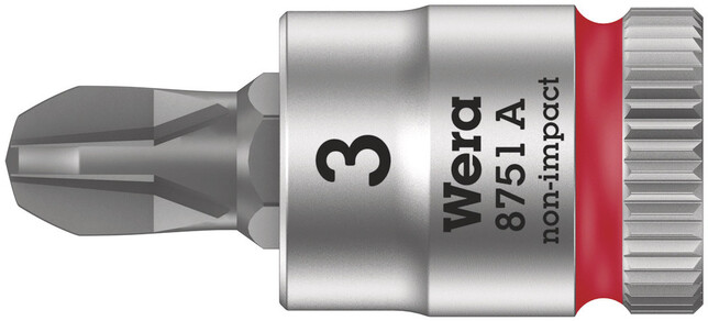 Vyhotovenie:K ručnému a strojného ovládaniu (non impact), so záchytnou drážkou guľôčky, ryhovanie na zadnom konci pre vysokú priľnavosť pri ručnom ovládaní; zástrčné nástavce s prednosťami technológie Wera Bit, matne chrómované. Farebné označenie profilu (červená = Phillips) a číselné označenie veľkosti pre jednoduché nájdenie požadovaného zástrčného nástavca.