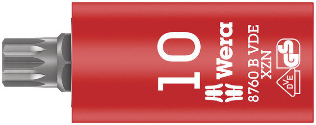 Vyhotovenie:Izolované vyhotovenie, kusová skúška podľa normy IEC 60900. Zvýšená bezpečnosť vďaka dvojzložkovej izolácii so žltým izolačným jadrom pod červenou vonkajšou izolačnou vrstvou, ktoré je pri prípadnom poškodení vonkajšej červenej izolačnej vrstvy VDE viditeľné. Krátke nástrčné hlavice s bitom s výhodami technológie bitov Wera.