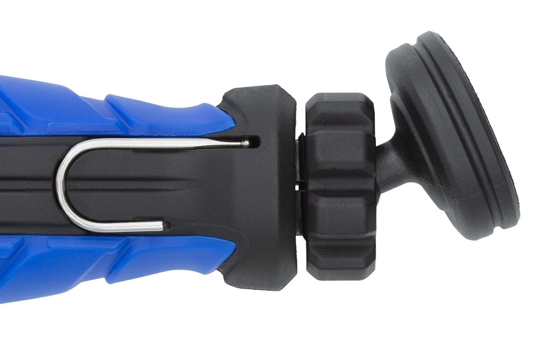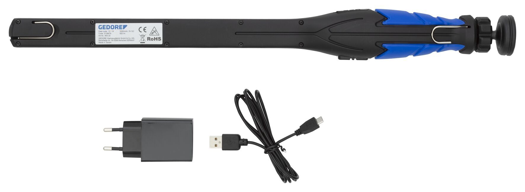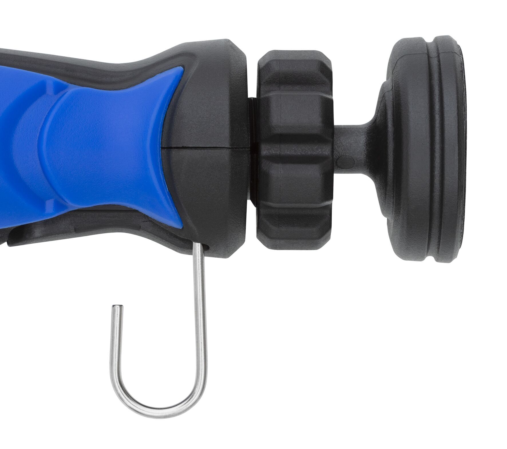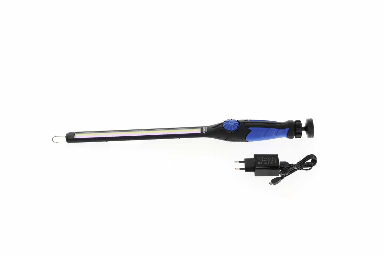 Univerzálna LED/UV lampa s ďalšími funkciami a štíhlou konštrukciou, najmä vhodná na použitie v automobilovom a priemyselnom sektore, ale aj na hobby účely. Bezstupňovo stmievateľná, prepínanie z LED svetla na modro-fialové UV svetlo (na detekciu netesností napr. v klimatizáciách, tepelných čerpadlách atď.), Dvojstranne skladacie háky, silný magnet na nastaviteľnej nohe pod uhlom 45° a silný mini magnet na konci, aby sa získali stratené malé časti na ťažko prístupných miestach. Možnosť nabíjania cez sieťový adaptér (súčasťou balenia) alebo cez USB port, 620 lumenov.