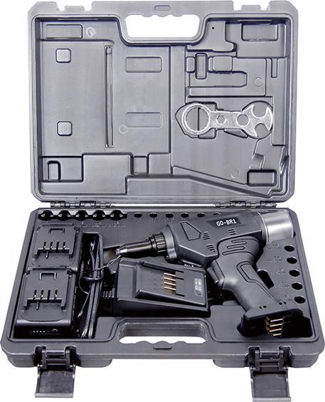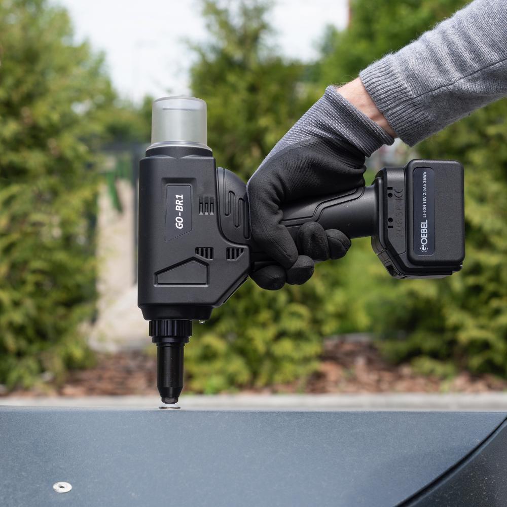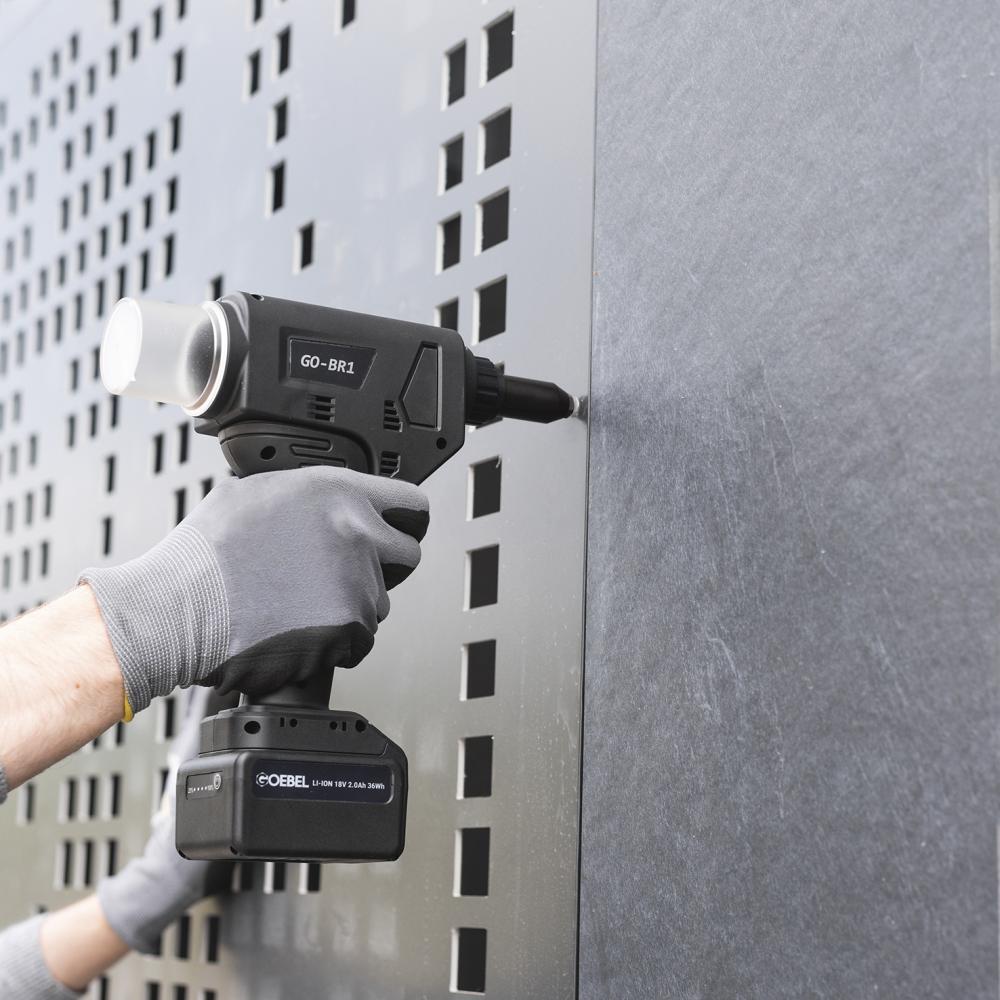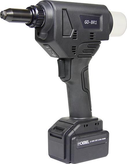 Akumulátorová nýtovacia pištoľ GO-BR1 Provedenie: Kompaktný kryt odolný proti nárazom s úchopom Softgrip a bezkartáčovým motorom pre dlhú životnosť a LED osvetlením pracovného priestoru. Vysoká bezpečnosť fungovania vďaka elektronickému ovládaniu a rovnakej rýchlosti dopredného aj spätného chodu uchopovacieho mechanizmu. Výmena závitových trňov bez použitia náradia a presné nastavenie zdvihu. Ovládanie sleduje nastavený usadzovací zdvih a tiež funkciu pridržania trhacích nýtov, aby bolo zabezpečené presné použitie. Použitie: Na trhacie nýty Ø 3 až 5 mm akéhokoľvek materiálu. Obsah dodávky: So 3 špičkami Ø 3–3,2; 4; 4,8–5 mm, 2 li-iontovými rýchlovýmennými akumulátormi 18 V/2 Ah, rýchlonabíjačka 18 V, v kufri ABS. Priřazení špičiek: Ø nýtu: 3–3,2; materiál nýtu: hliník, oceľ, nerez Ø nýtu: 4; materiál nýtu: hliník, oceľ, nerez Ø nýtu: 4,8–5; materiál nýtu: hliník, oceľ, nerez Výrobca: Goebel GmbH, Mühlenstr., 40699 Erkrath, DE, +492112450000, info@goebel-group.com