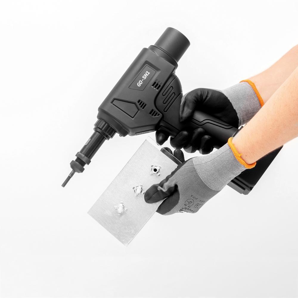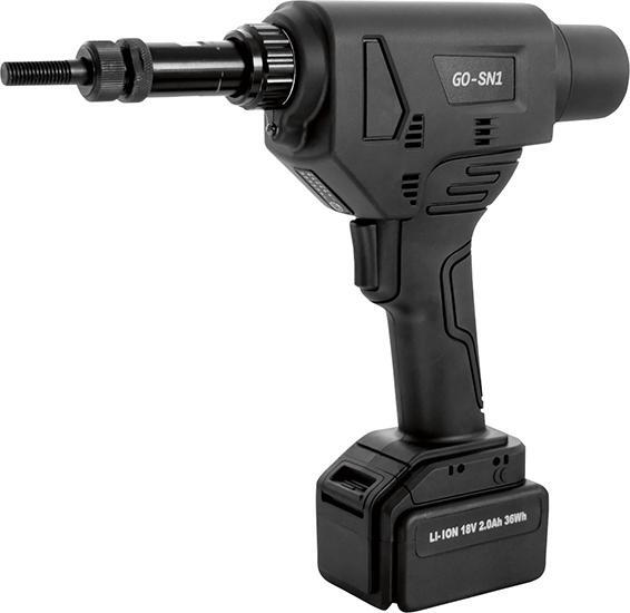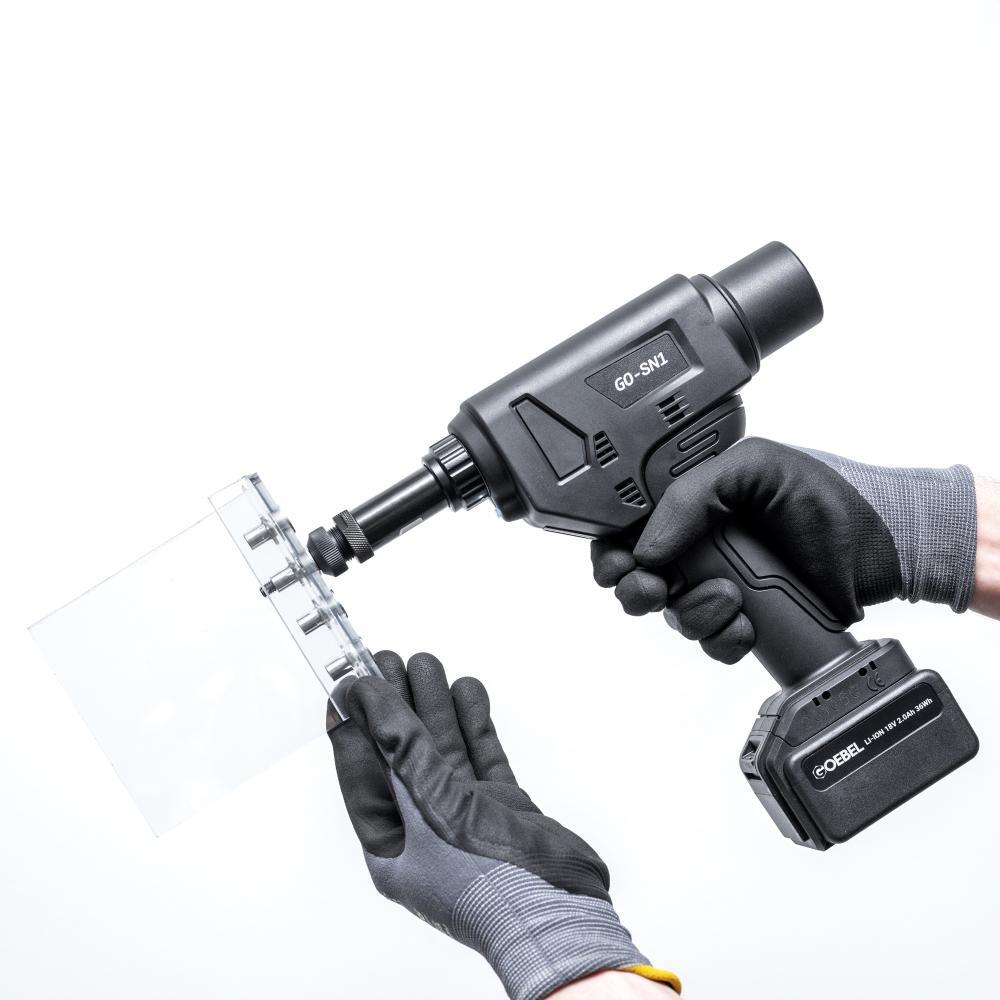 Aku nýtovacia pištoľ na matice GO-SN1 pre rozpěrné nýtovacie matice Provedenie: Kompaktný kryt odolný proti úderom s úchopom Softgrip a bezkartáčovým motorom pre dlhú životnosť a LED pre osvetlenie pracovného priestoru. Vysoká bezpečnosť fungovania vďaka elektronickému ovládaniu. Proces zasúvania a navŕtavania je funkčne oddelený. Výmena závitových trňov bez použitia náradia a presné nastavenie zdvihu pomocou ovládacieho panela na prístroji. Ovládanie sleduje nastavený usadzovací zdvih, aby bolo zabezpečené presné použitie. Použitie: Pre rozpěrné nýtovacie matice M5 až M10 z hliníka, ocele a nerezu. Obsah dodávky: Aku pištoľ na nýtovacie matice GO-SN1, 2 li-ion rýchlovýmenné akumulátory 18 V/2,0 Ah, rýchlonabíjačka 18 V, 4 závitové trny M5, M6, M8, M10, 4 špičky M5, M6, M8, M10, v kufri ABS. Výrobca: Goebel GmbH, Mühlenstr., 40699 Erkrath, DE, +492112450000, info@goebel-group.com