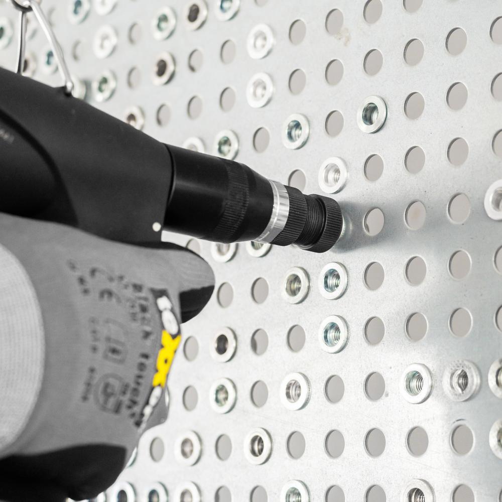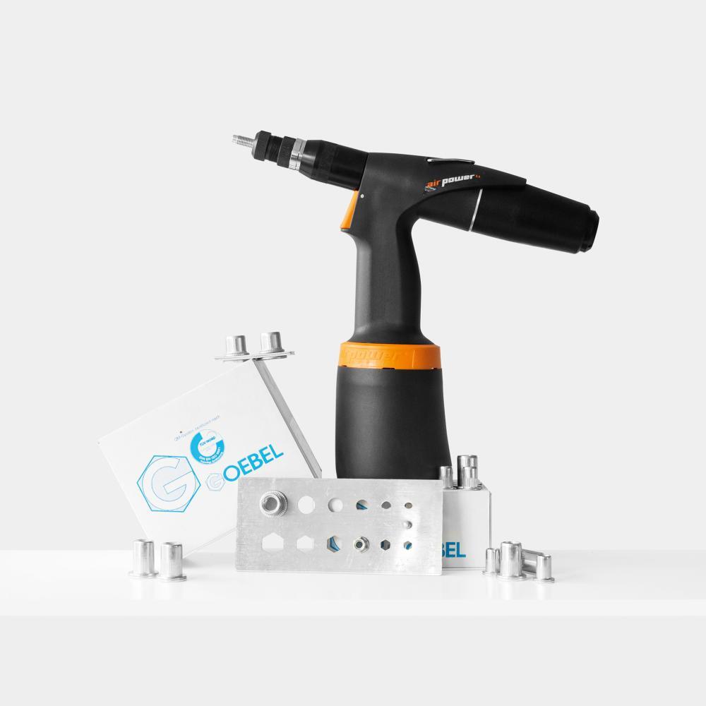 Nástroj na usadzovanie matic trhacích nýtov a skrutiek AIRPOWER 4, pneumaticko-hydraulický Provedenie: Kompaktný kryt odolný proti nárazom. Proces zasadzovania a navŕtavania je funkčne oddelený. Výmena závitových trňov bez použitia náradia a presné nastavenie zdvihu. Zapustený držiak pre zavesenie, ochrana rúk a ergonomická rukoväť zabezpečujú neunavujúcu prácu. Vzadu umiestnené pripojenie, ktoré sa dá otočiť o 360°, zabraňuje negatívnemu pôsobeniu hadice. Použitie: Pre nýtovacie matice M3 až M10 akéhokoľvek materiálu a M3 až M12 z hliníka a ocele. Obsah dodávky: Nástroj na usadzovanie matic trhacích nýtov a skrutiek AIRPOWER 4, prestrojovacie sady na nýtovacie matice M4–M8 (M10 a M12 k dispozícii na požiadanie). Výrobca: Goebel GmbH, Mühlenstr., 40699 Erkrath, DE, +492112450000, info@goebel-group.com
